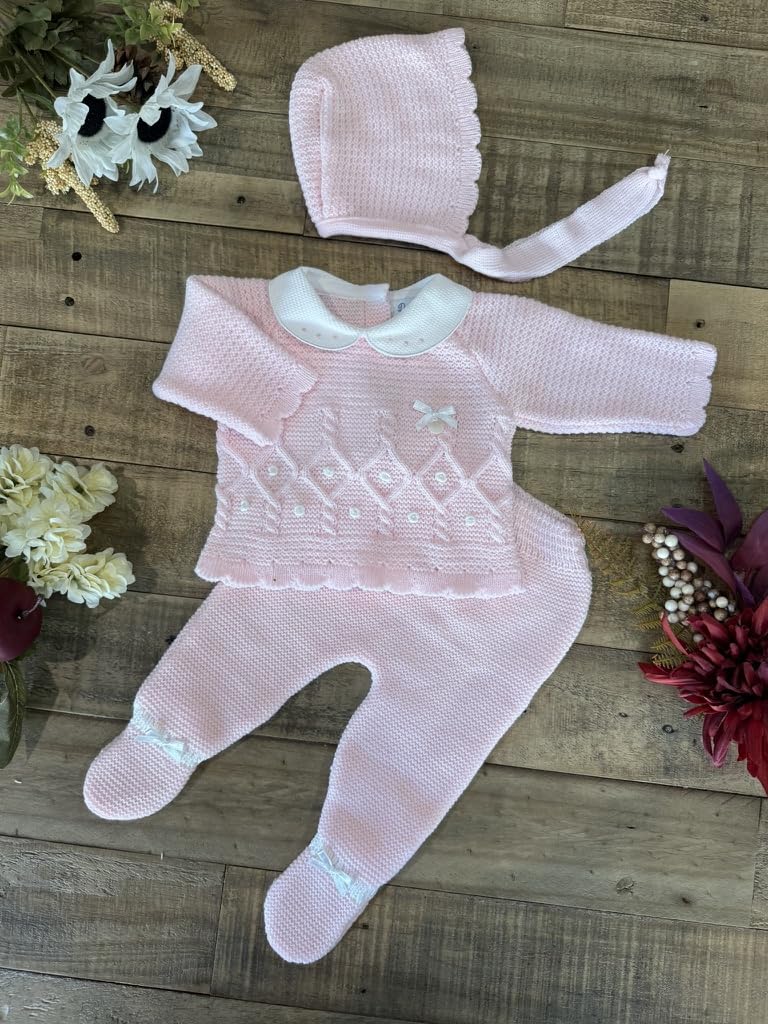 Keep your little one cozy in this soft pink three-piece knitted set. Featuring a charming sweater, footed pants, and matching hat, it’s perfect for warmth and style. Crafted in Spain from gentle, breathable yarn for all-day comfort.