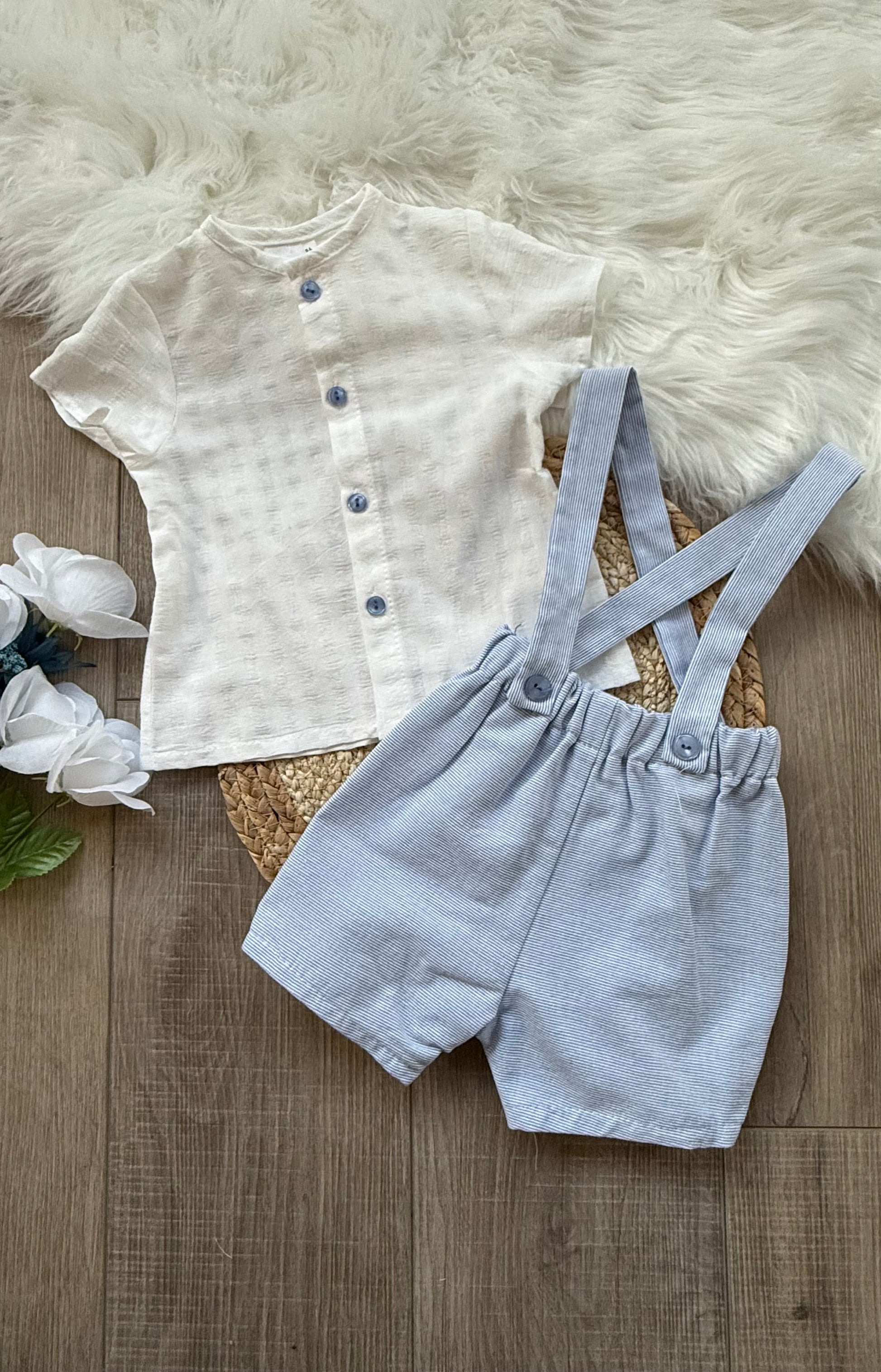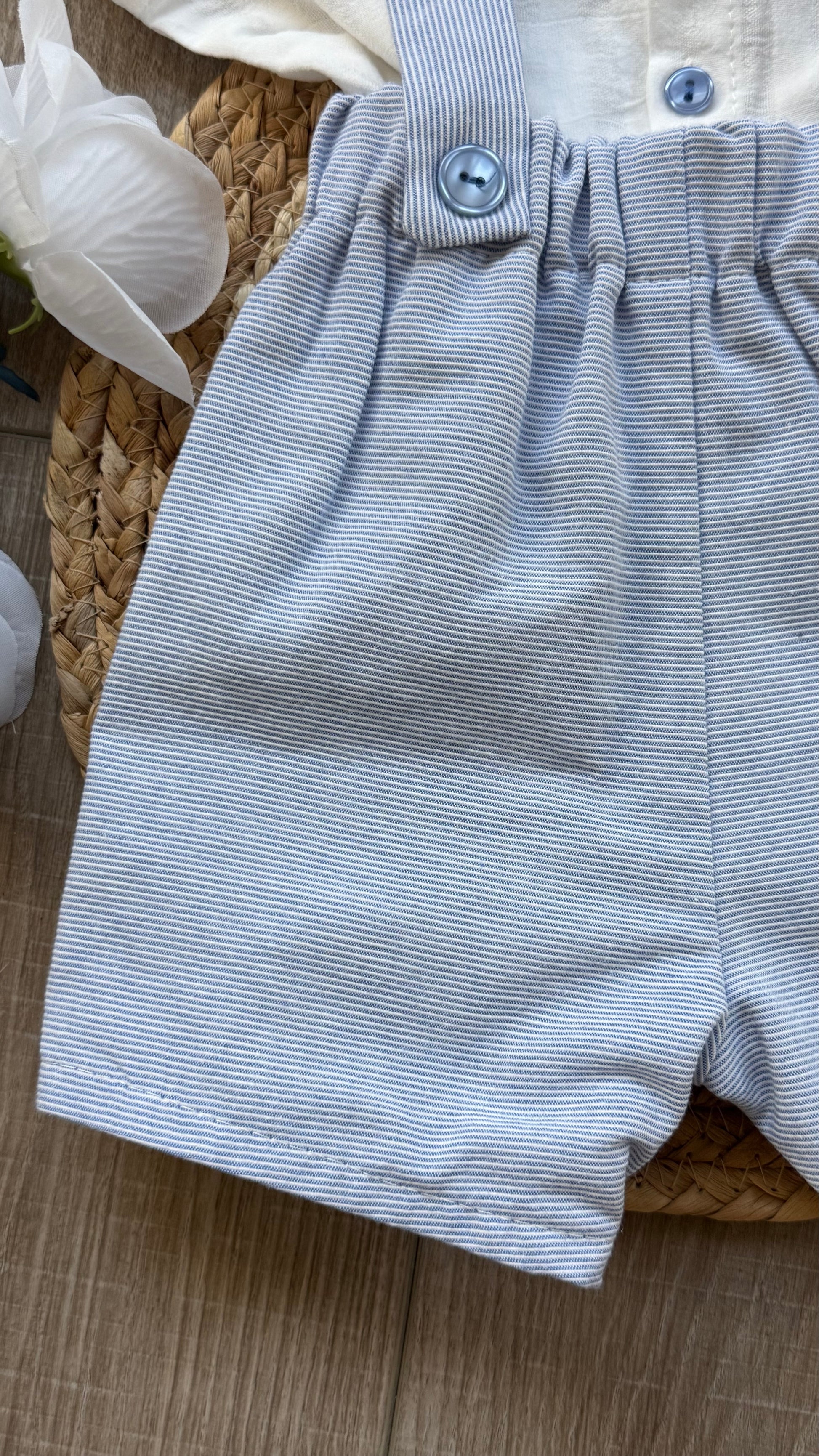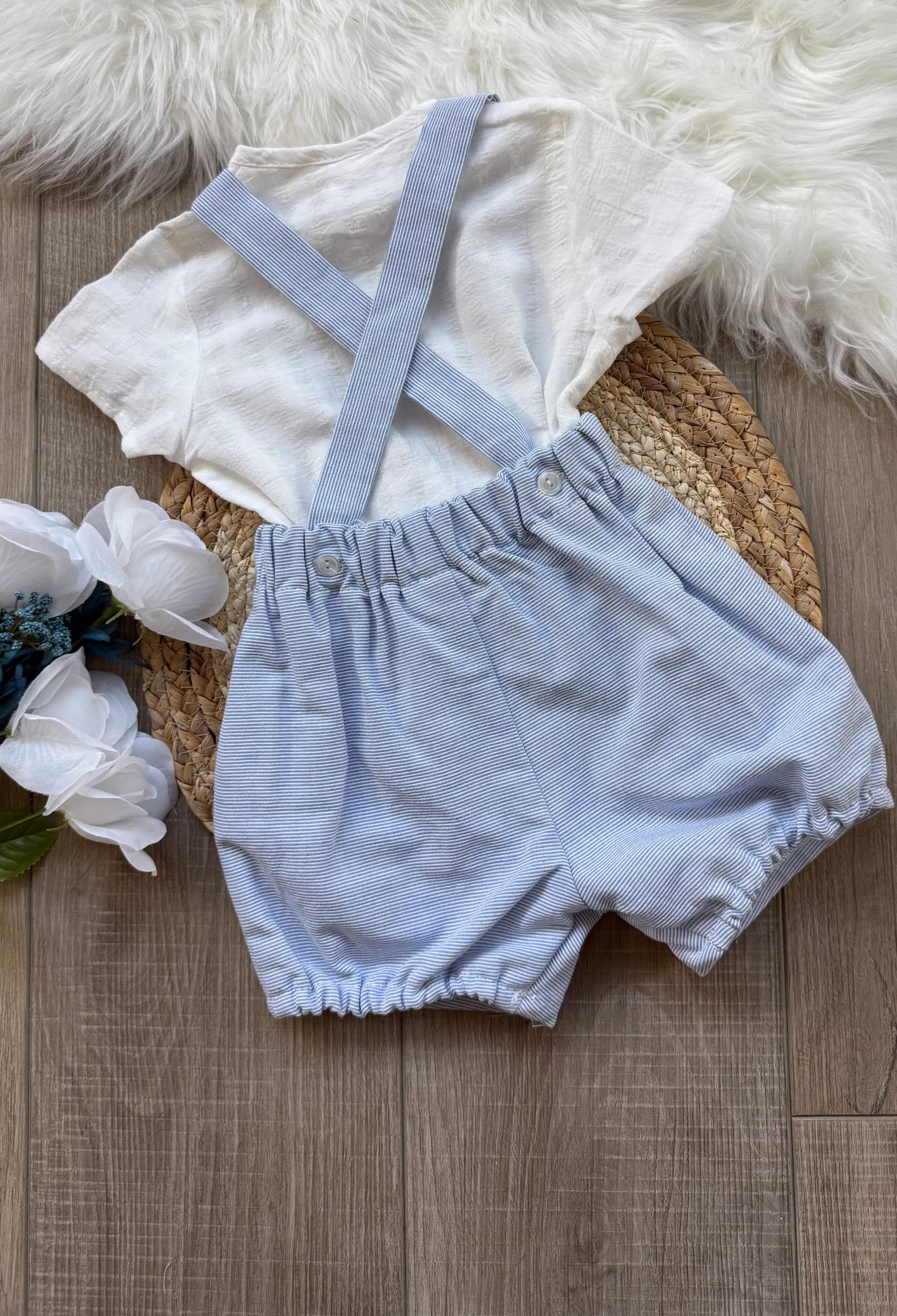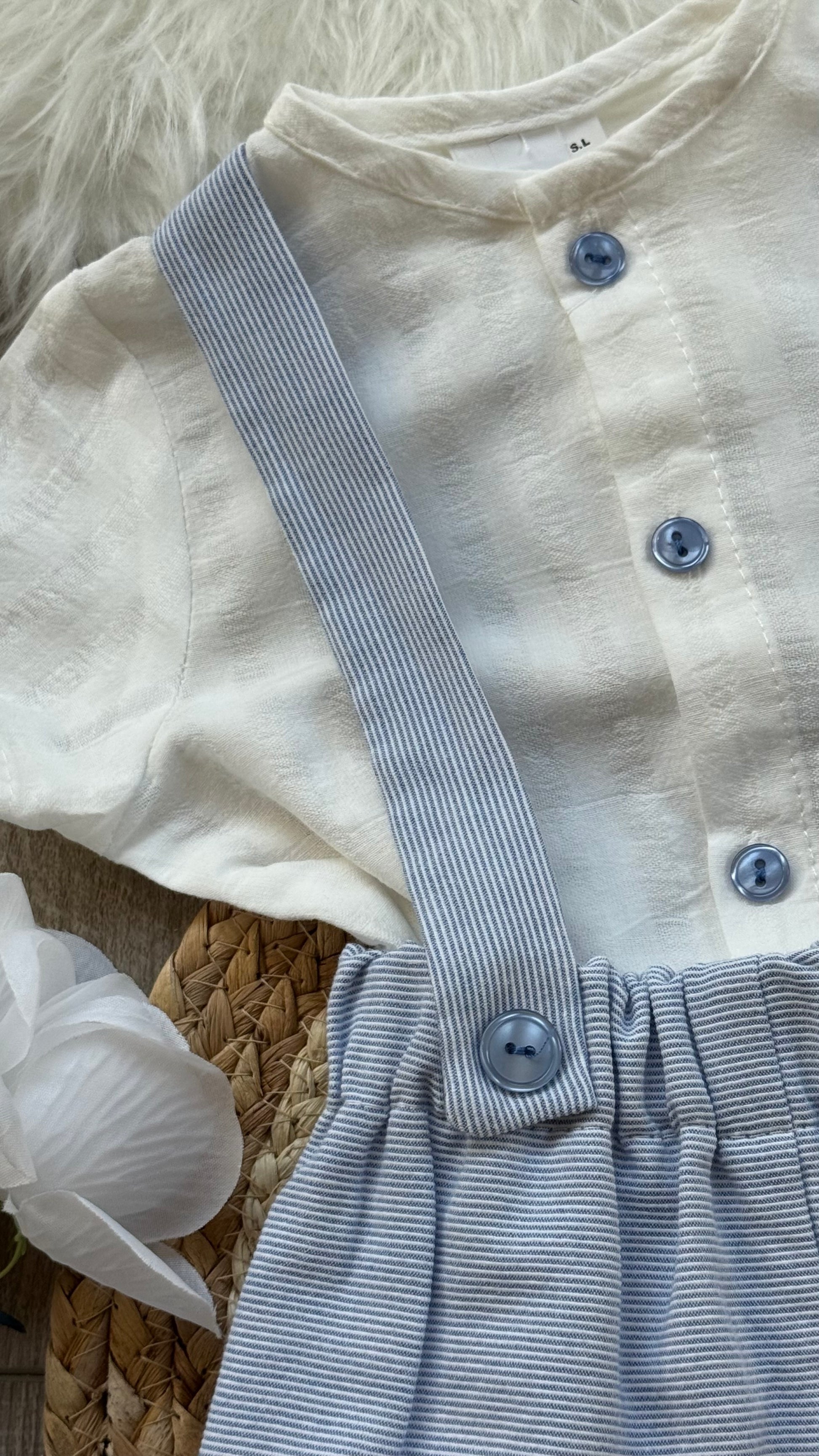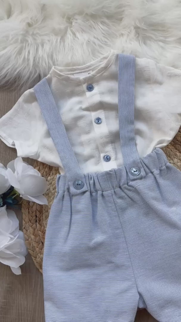 Dress your baby in classic style with this charming two-piece set. It features a white short-sleeve top with button closures and light blue suspender shorts with an elastic waistband for comfort. Made from soft, breathable fabric, it’s perfect for everyday wear or special occasions.