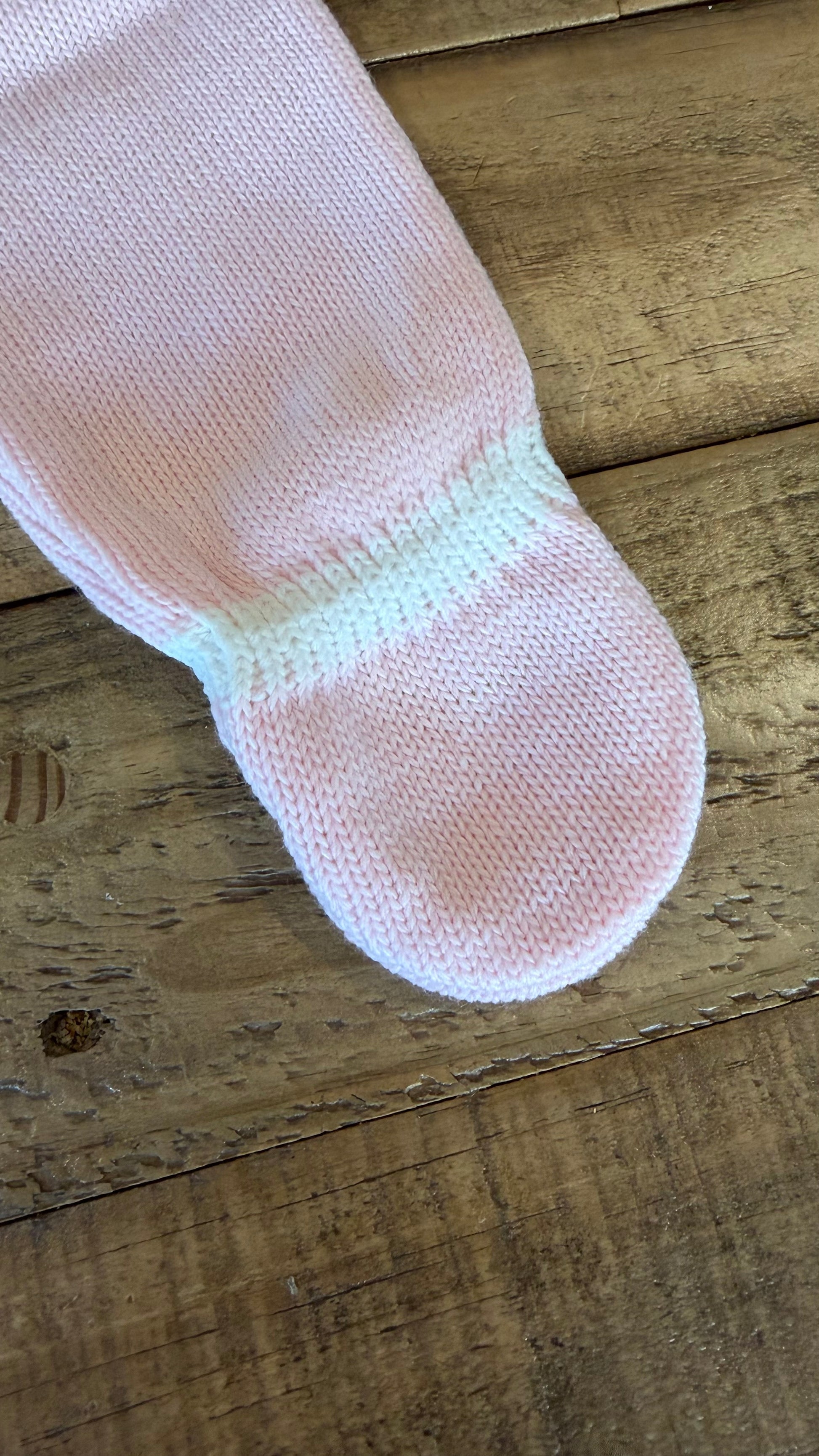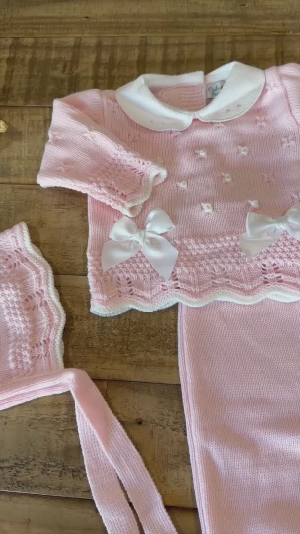 A charming knitted set with lace details, pearl-like buttons, satin bows, and a delicate collar. Complete with matching pants and bonnet, it’s perfect for cozy days or special moments.