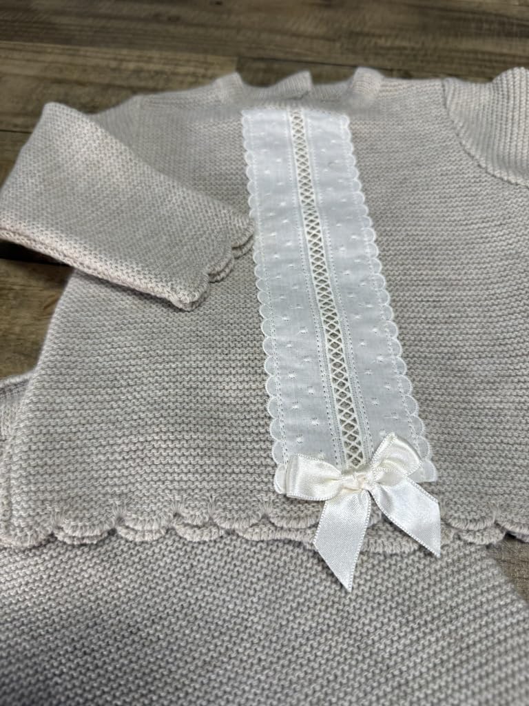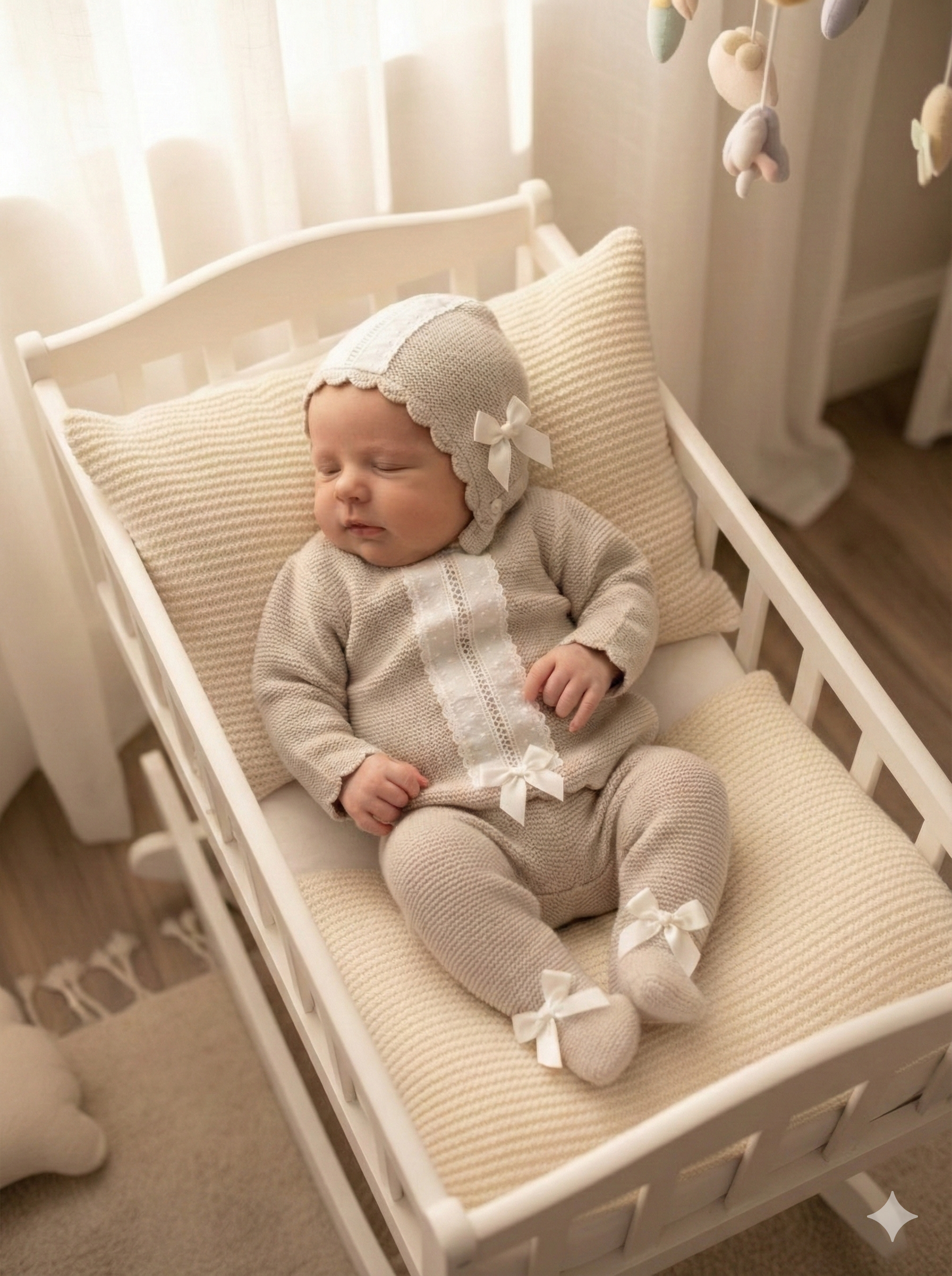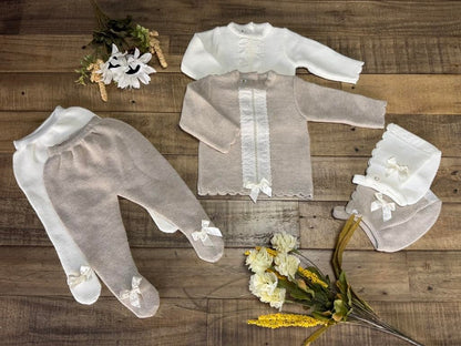 A soft, cozy 3-piece layette set with a long-sleeved top, footed pants, and matching hat. Gentle on delicate skin, with a timeless neutral design for boys or girls.