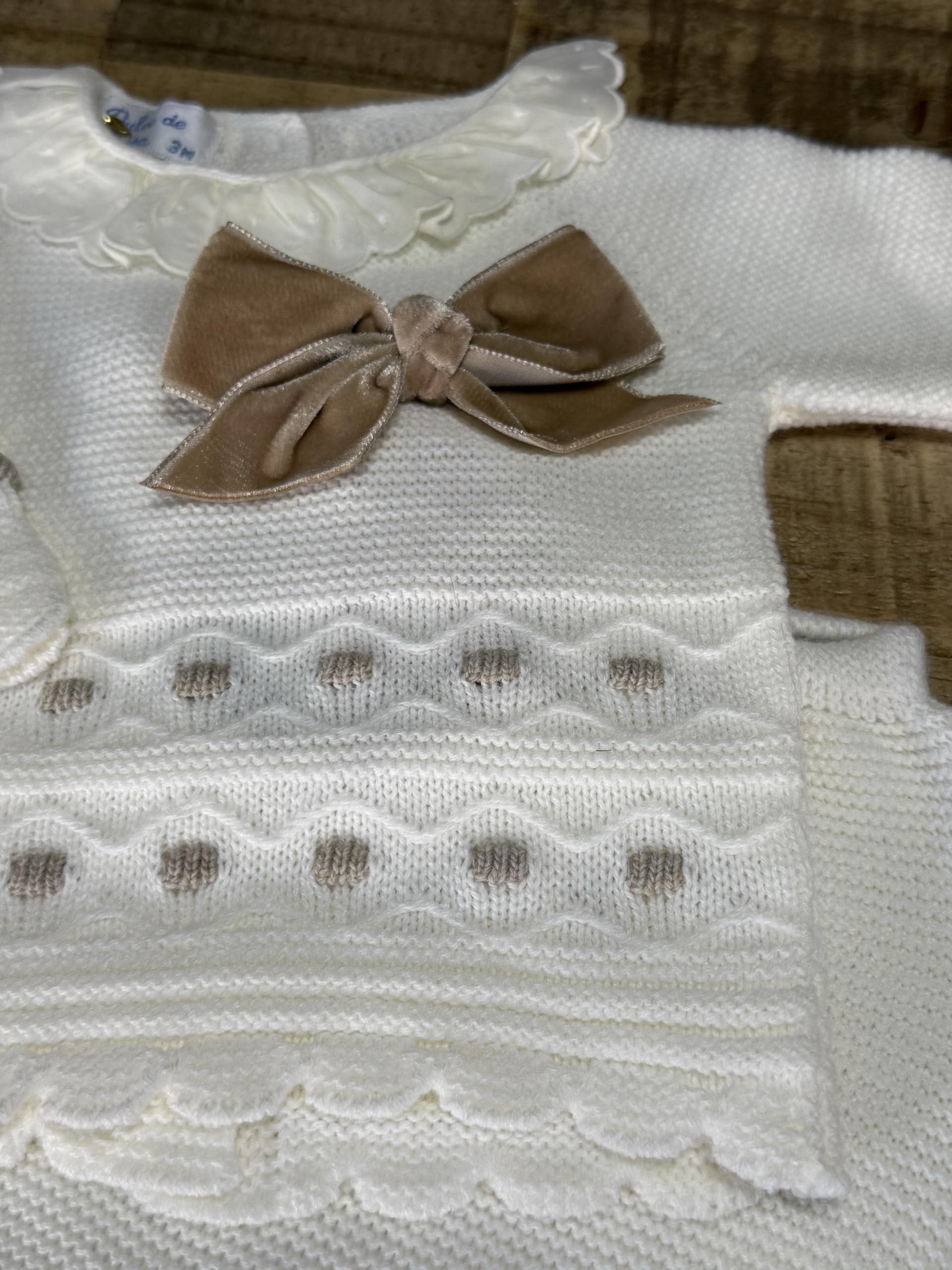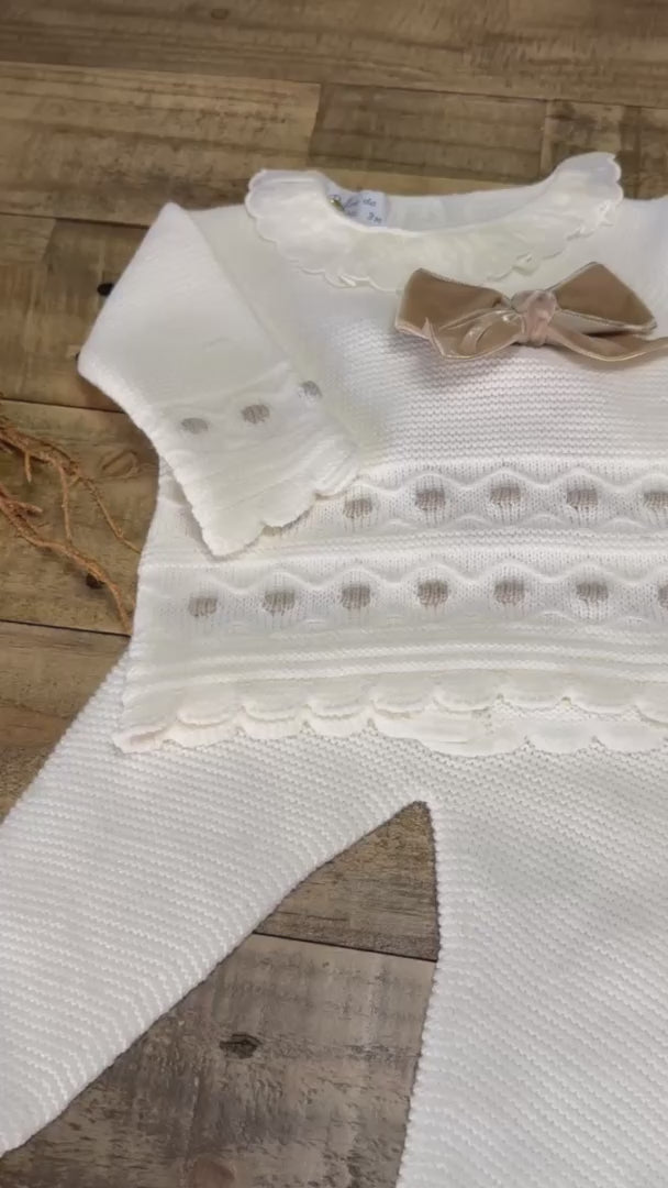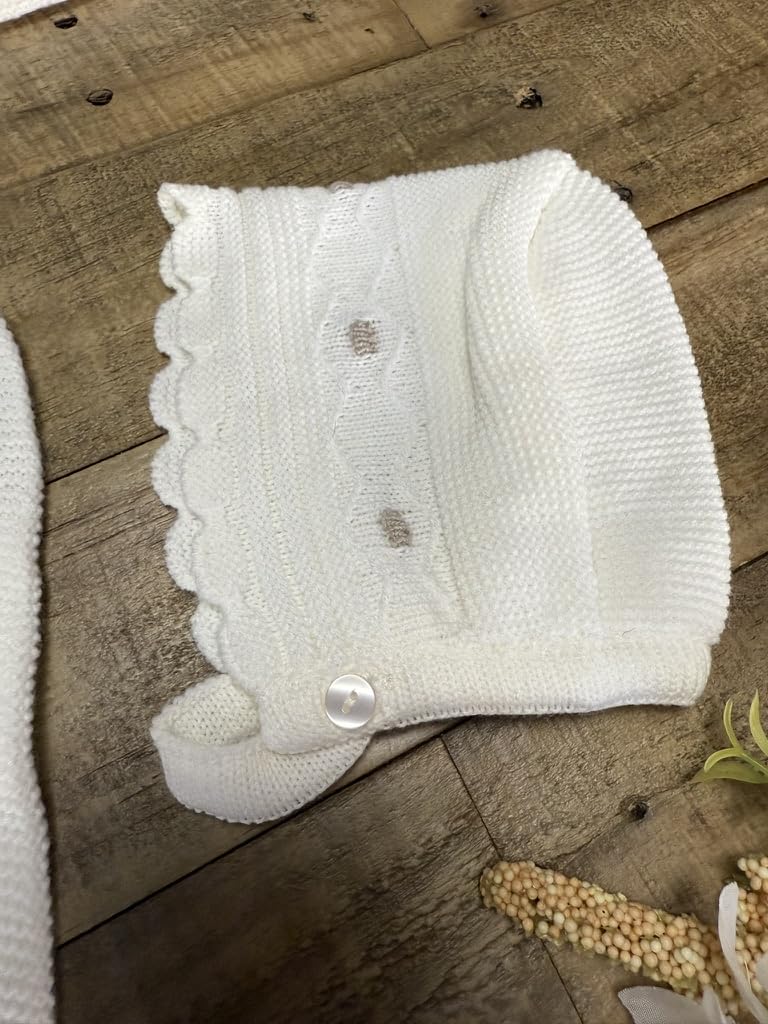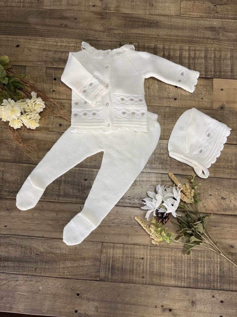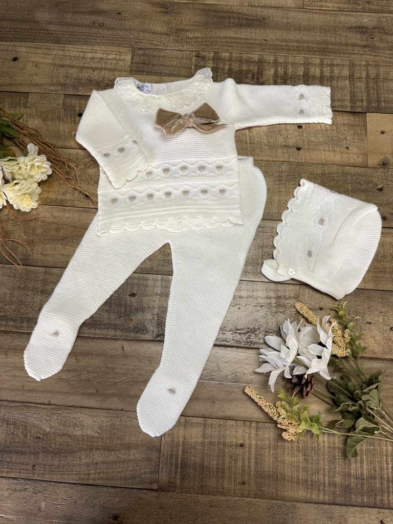 A sweet, cozy knitted set featuring a soft sweater with embroidered details and a bow, paired with matching footed pants and hat. Perfect for special moments or everyday snuggles.