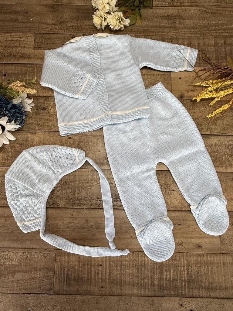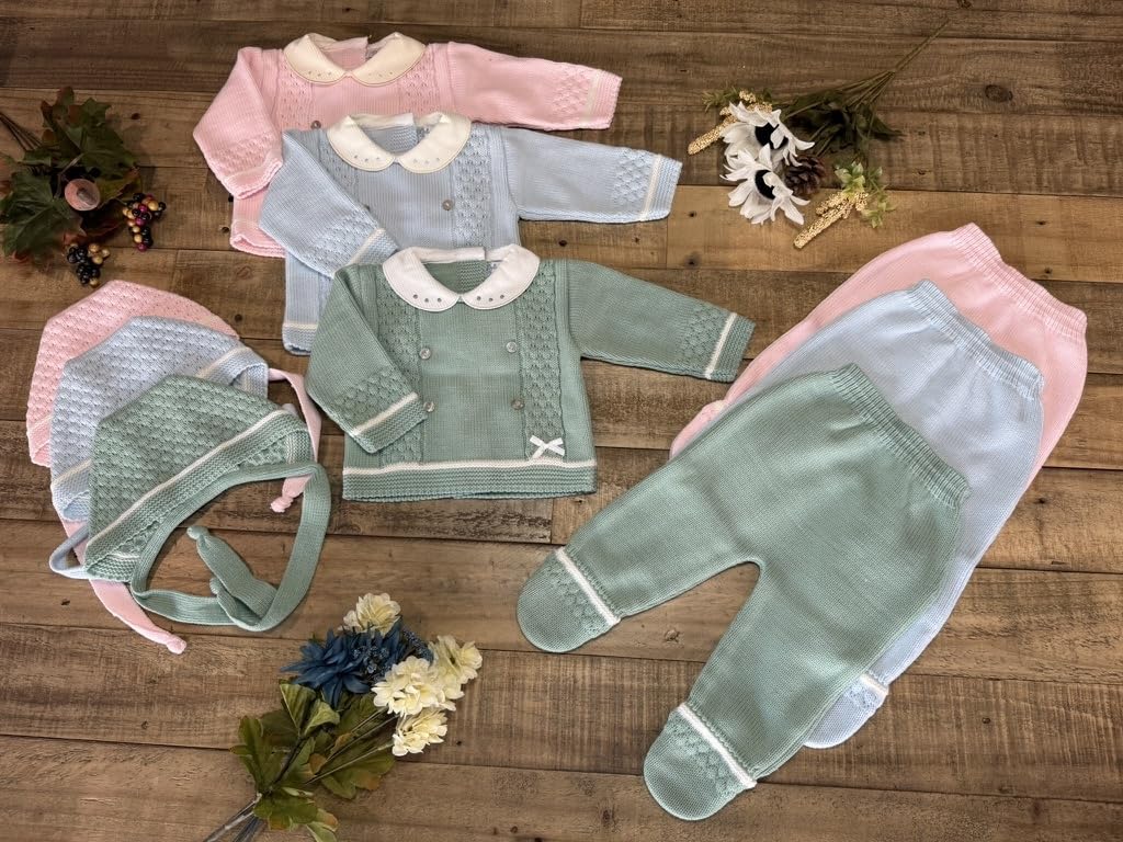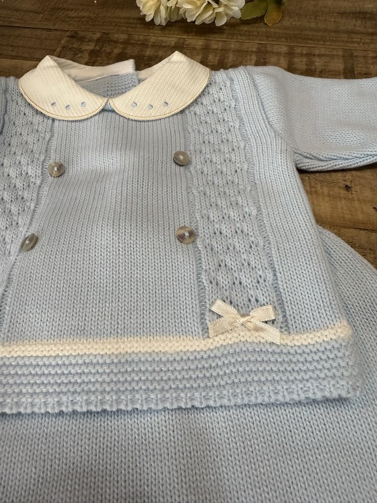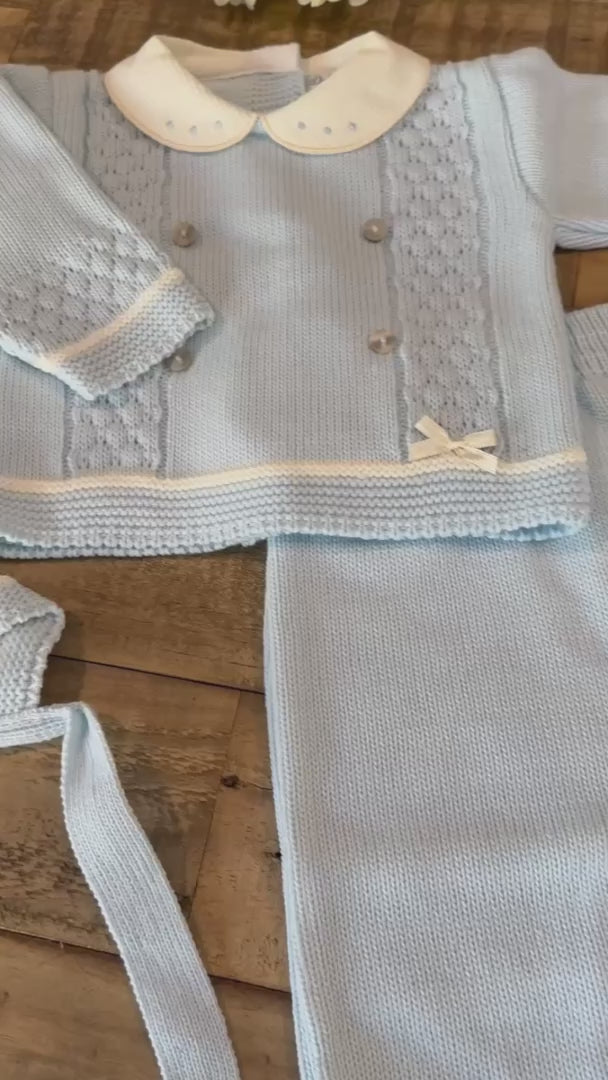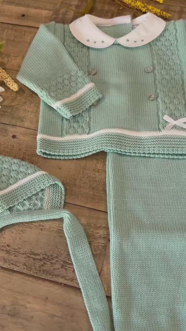 A timeless knitted set for your little one, featuring a soft collared sweater with decorative buttons, matching pants, and a cozy hat. Perfect for special occasions or everyday elegance.