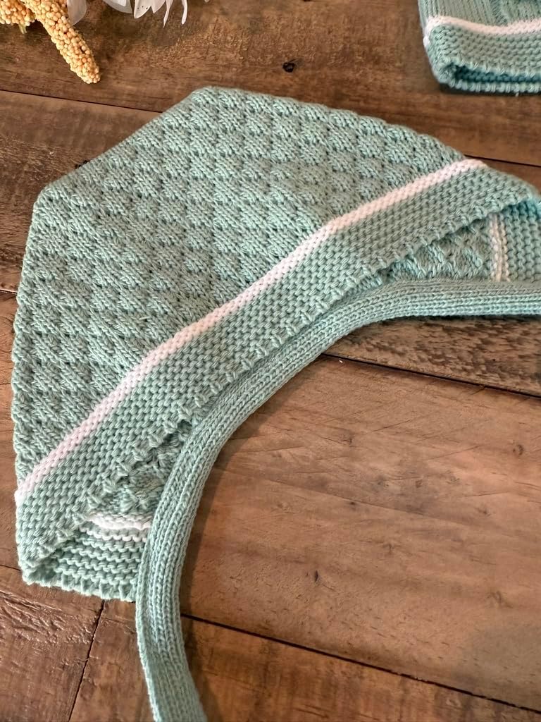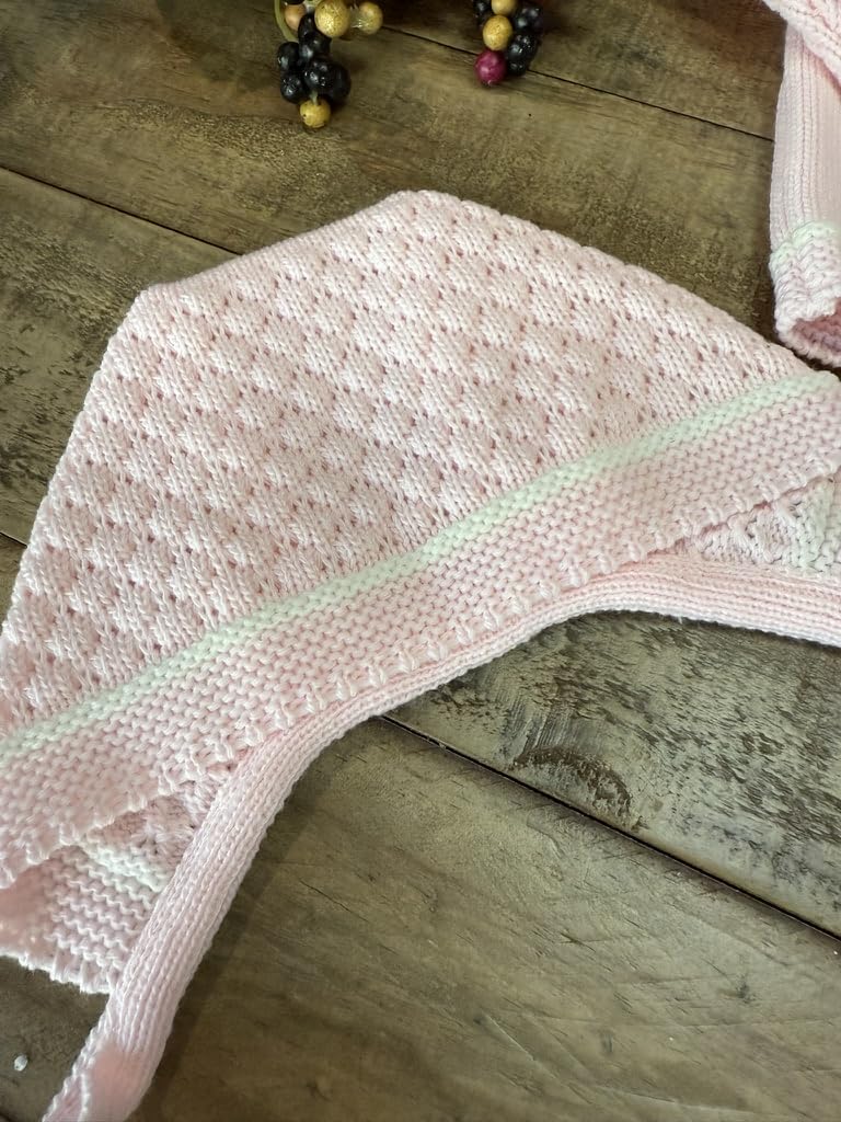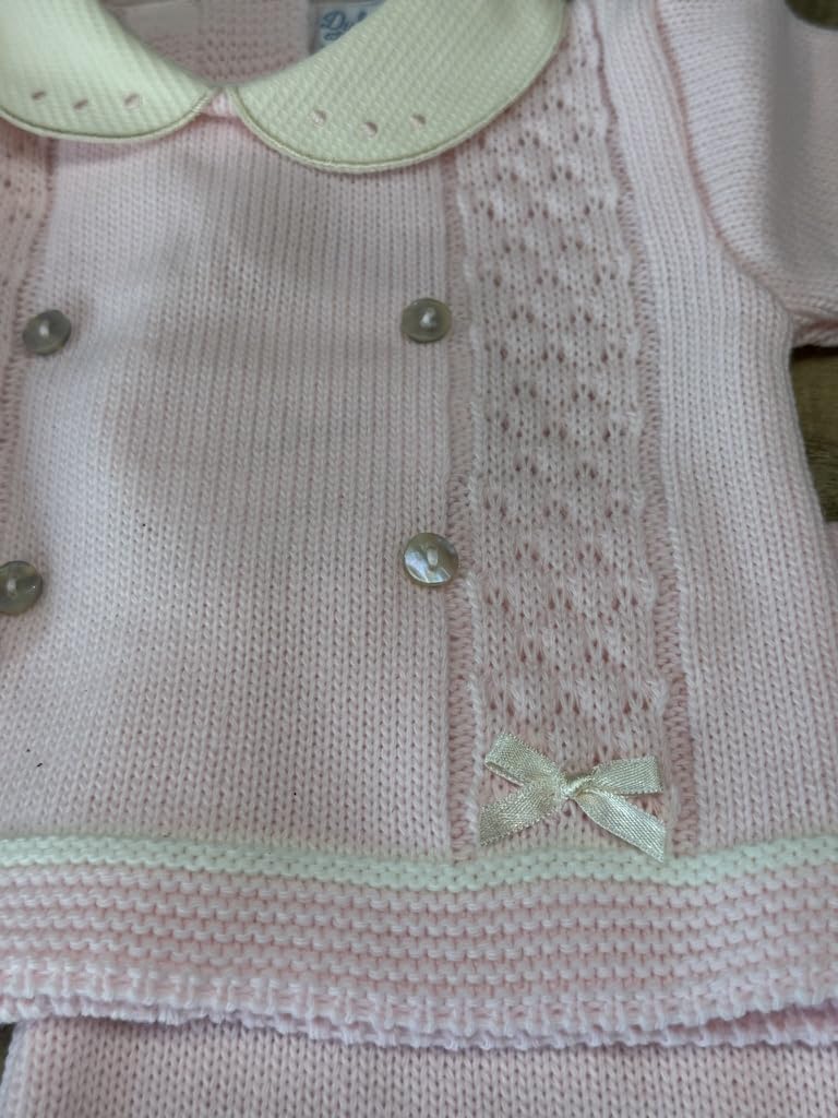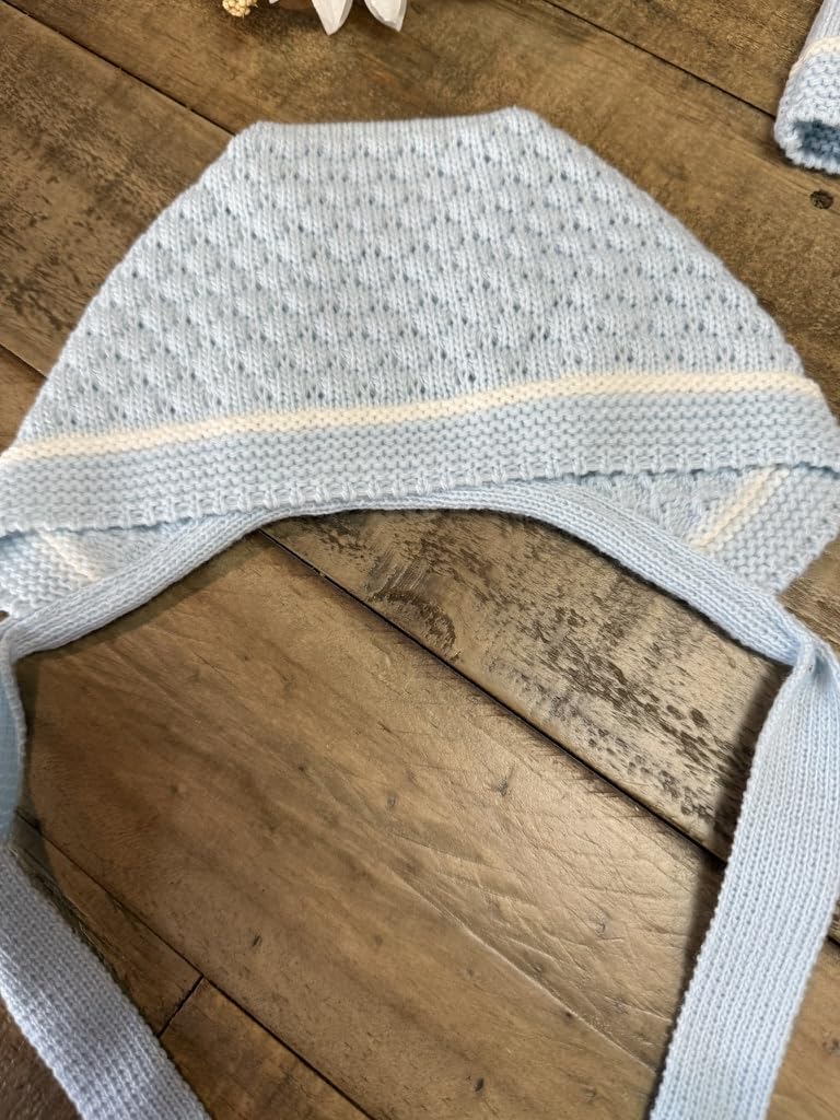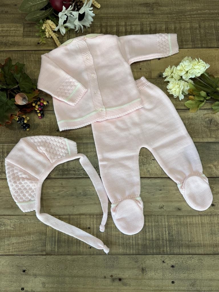 A timeless knitted set for your little one, featuring a soft collared sweater with decorative buttons, matching pants, and a cozy hat. Perfect for special occasions or everyday elegance.