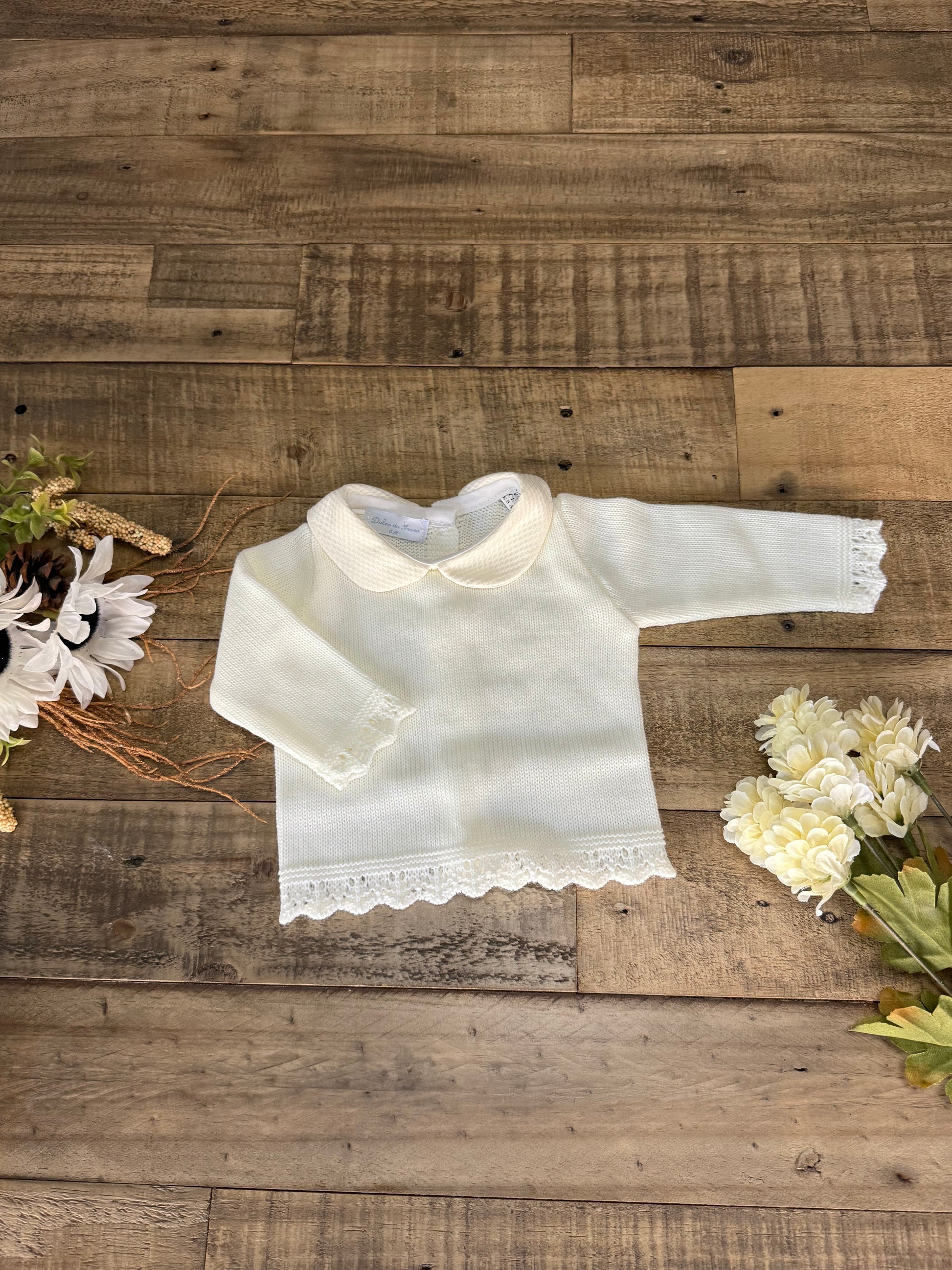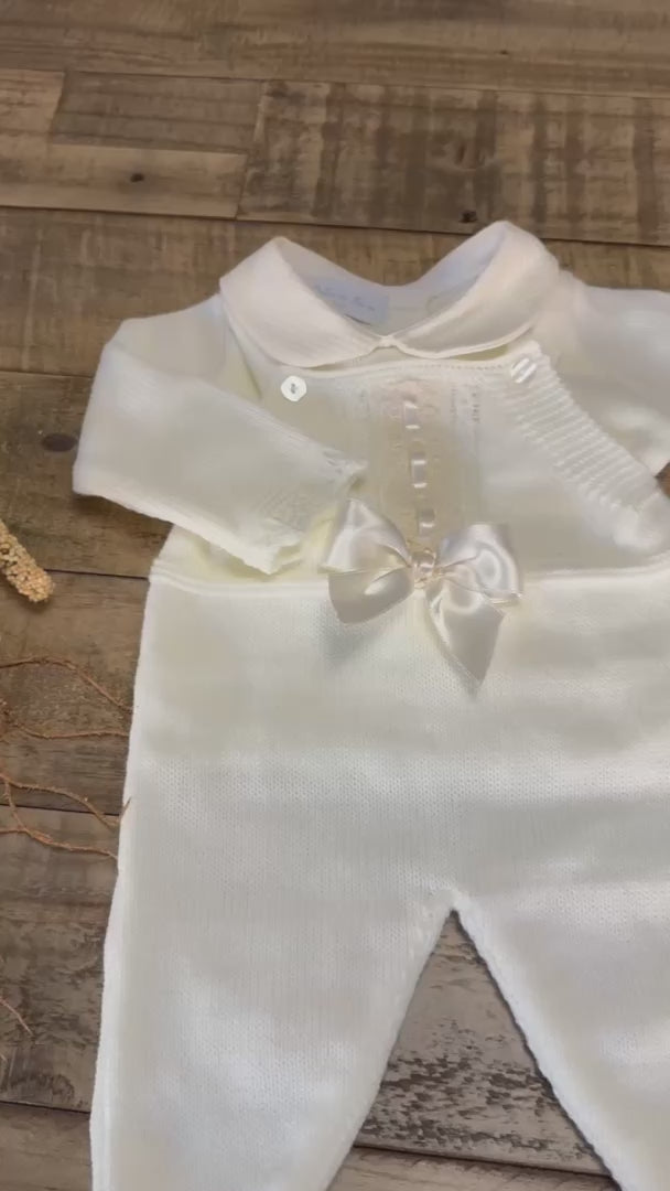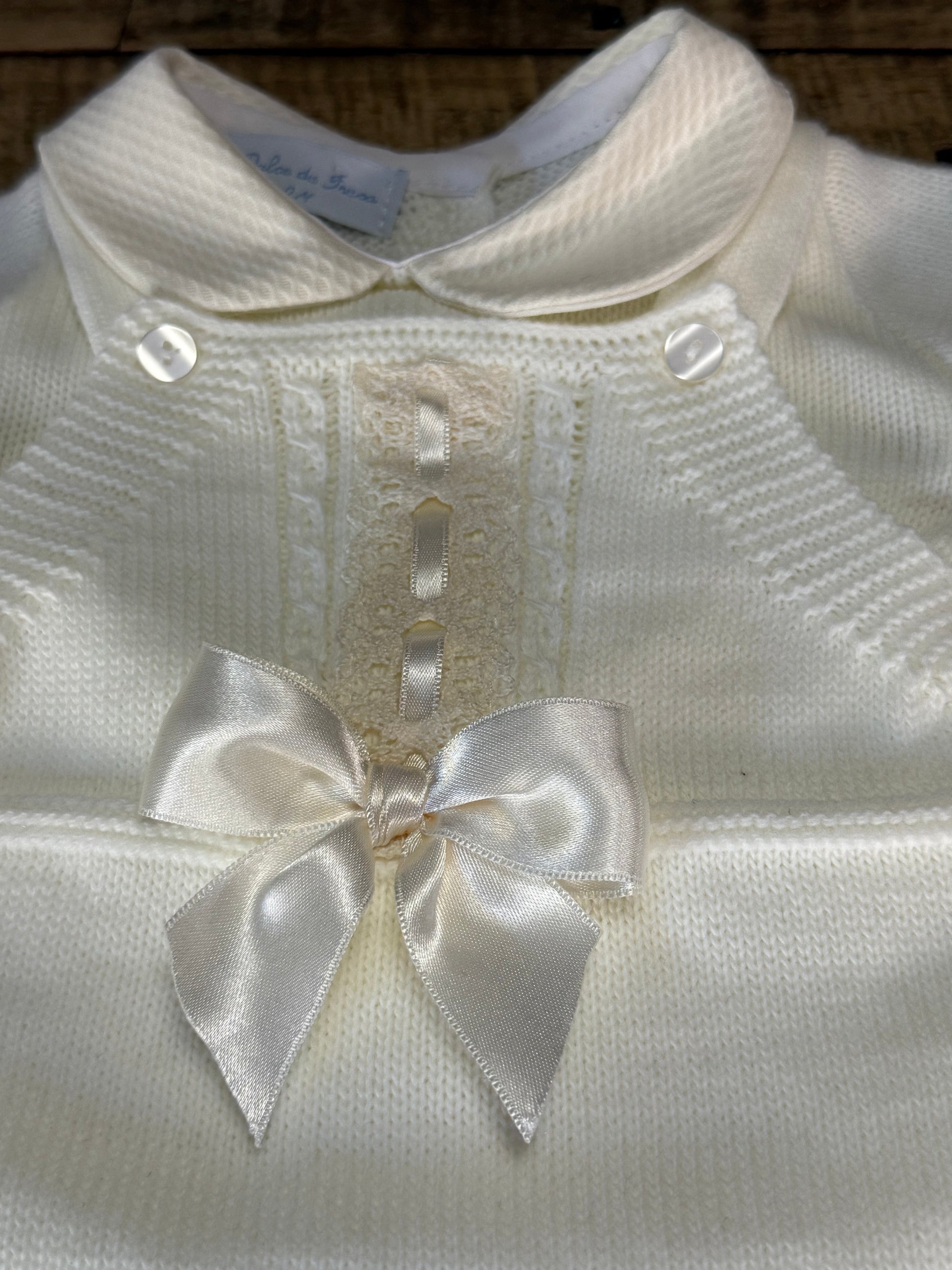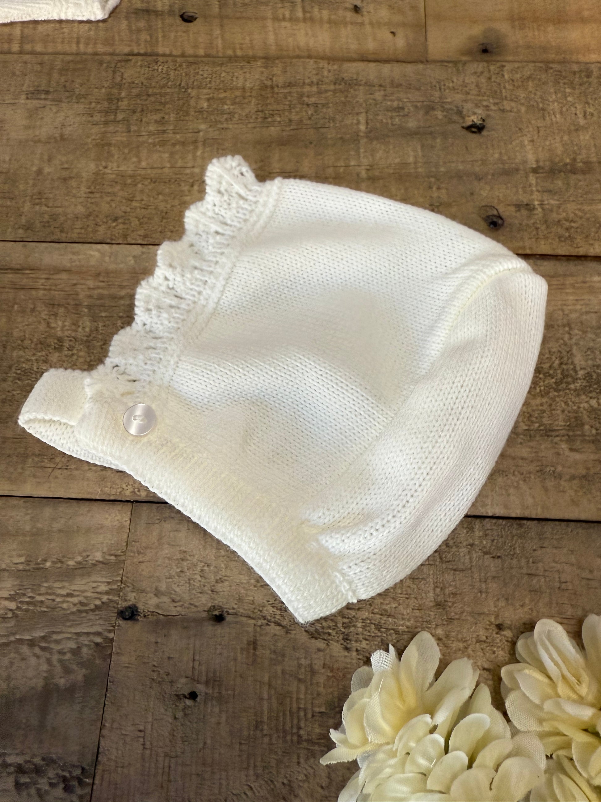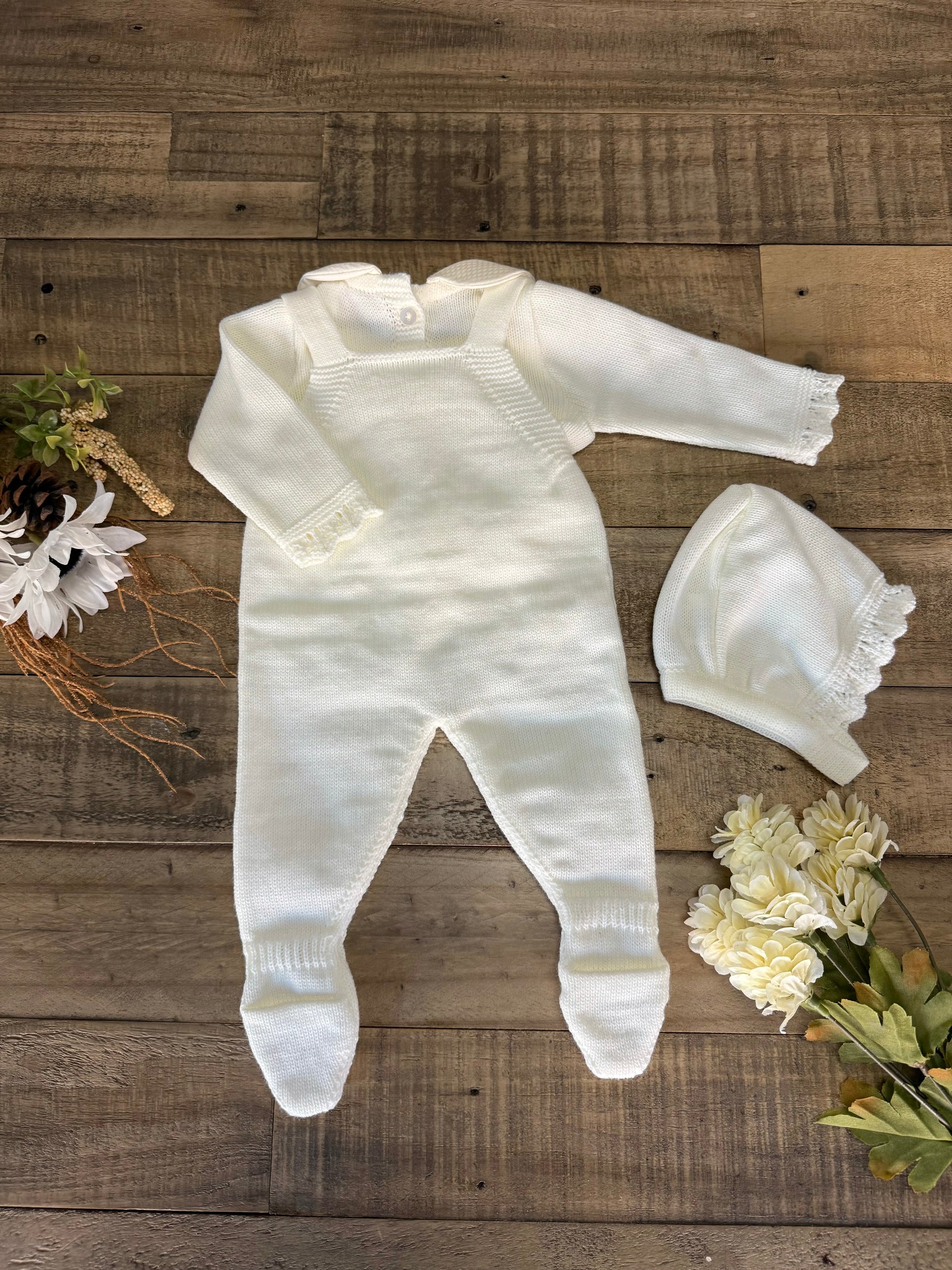Welcome your baby with this soft, cream-colored 3-piece set featuring a lace-trimmed romper, long-sleeved shirt, and matching bonnet for cozy, stylish comfort.
