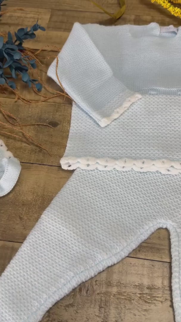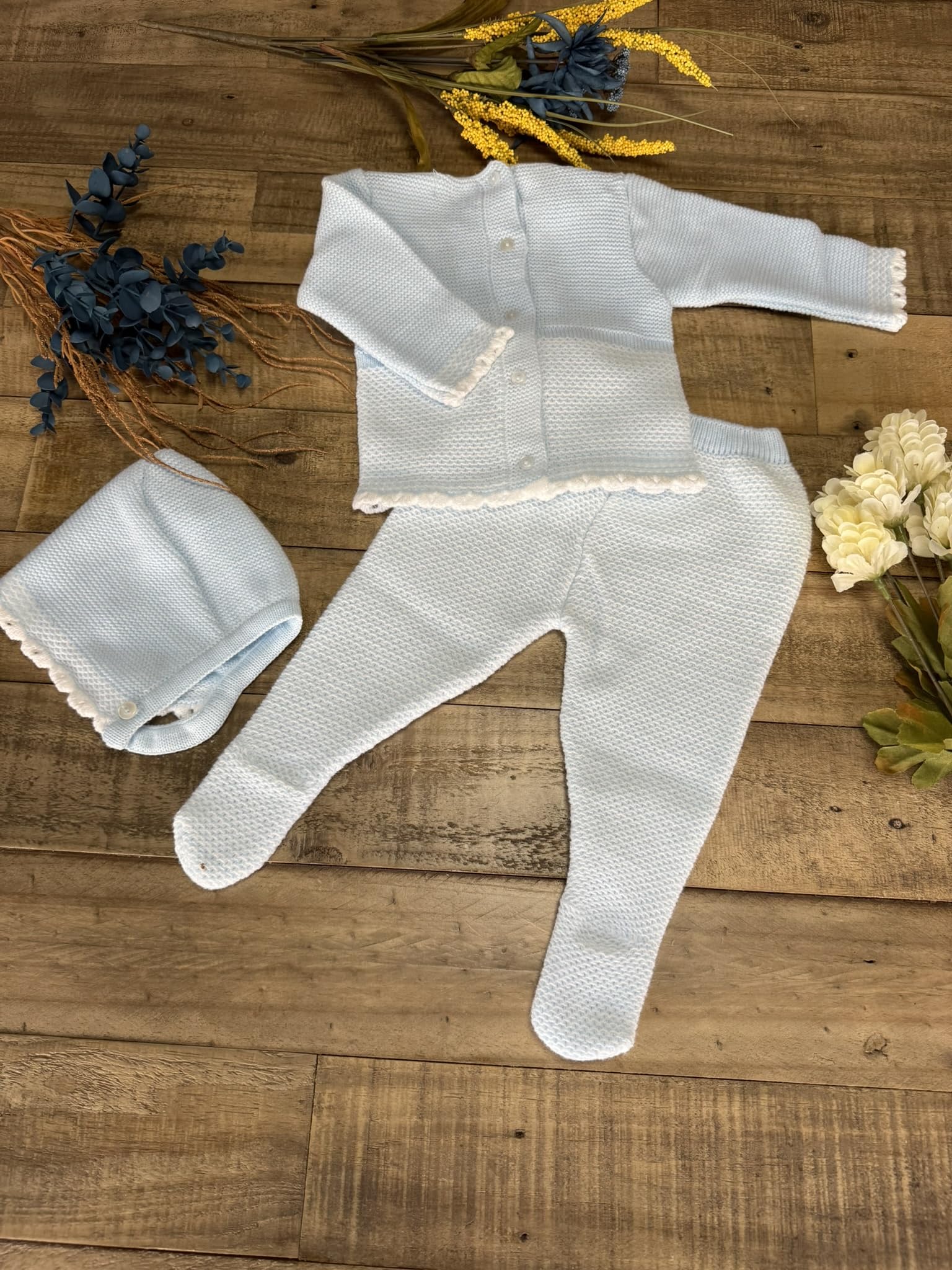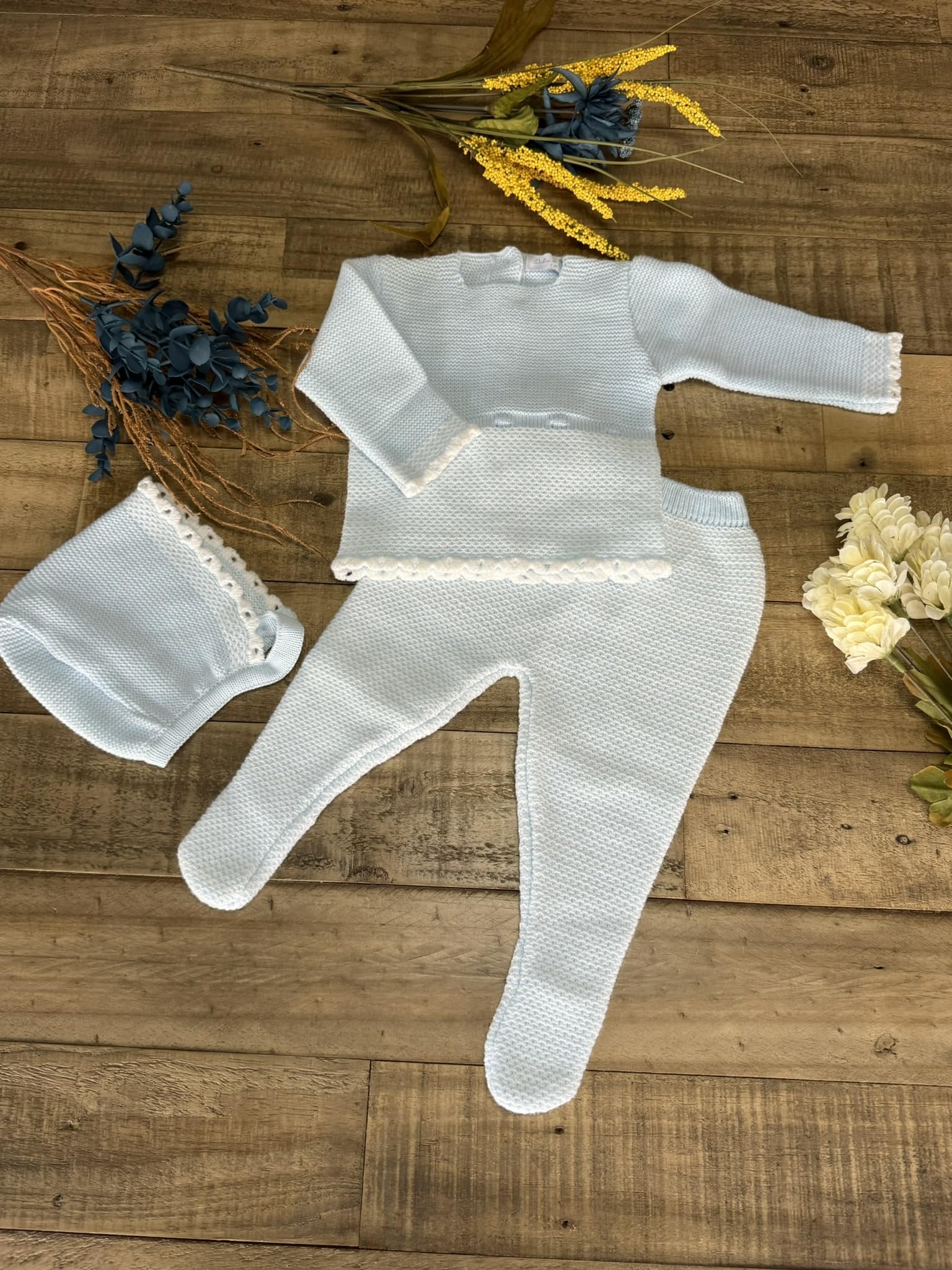 Keep your baby cozy and stylish with this soft, lightweight knitted 3-piece set. Featuring a long-sleeved top, footed pants, and hat in soothing hues with delicate stitching, it’s perfect for everyday wear or special moments.
