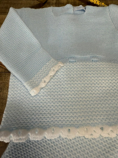 Keep your baby cozy and stylish with this soft, lightweight knitted 3-piece set. Featuring a long-sleeved top, footed pants, and hat in soothing hues with delicate stitching, it’s perfect for everyday wear or special moments.