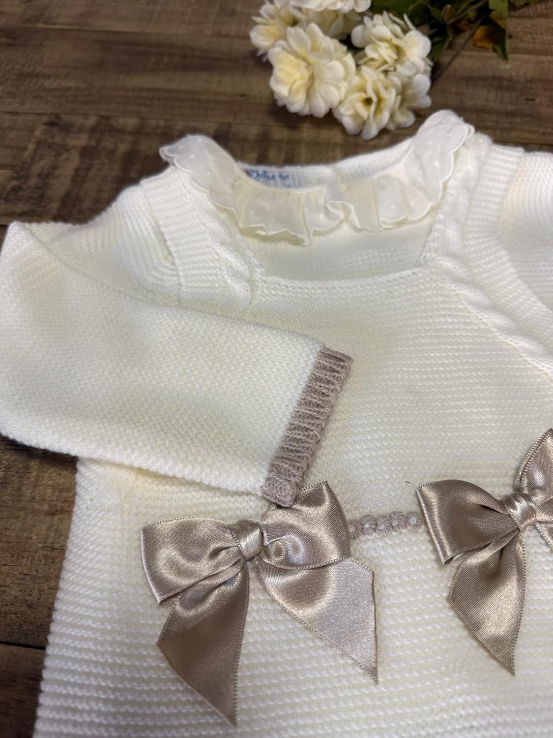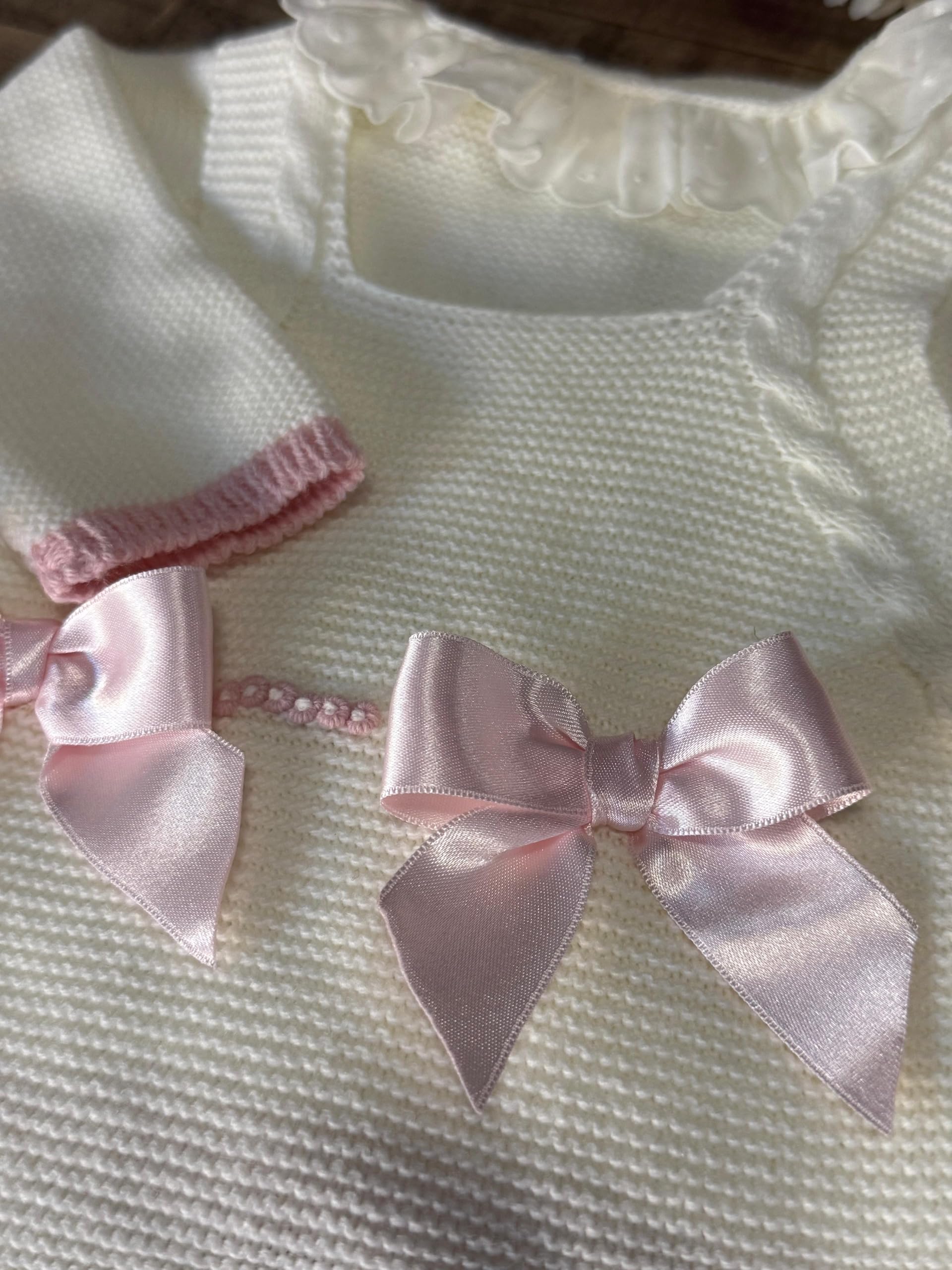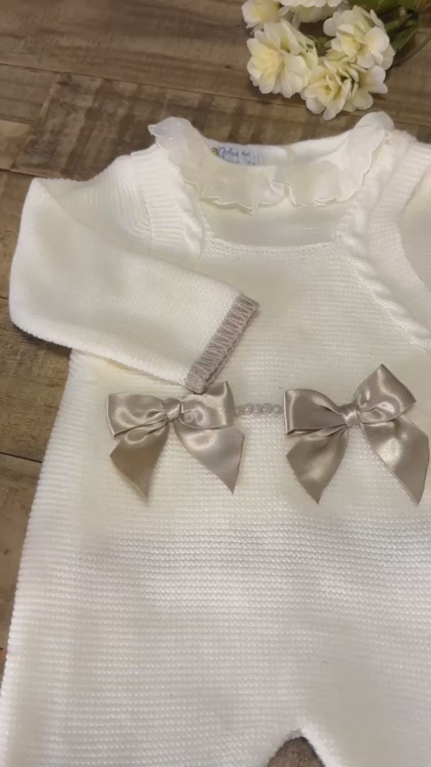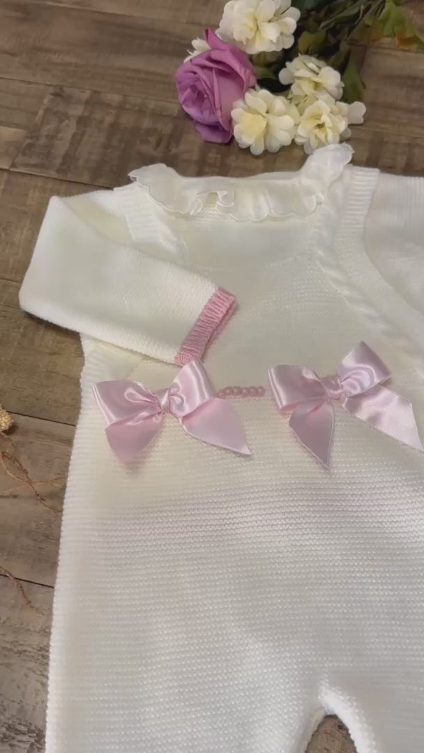 Timeless and elegant, this soft knitted romper with delicate satin bows and matching hat keeps your baby cozy and stylish for any occasion.