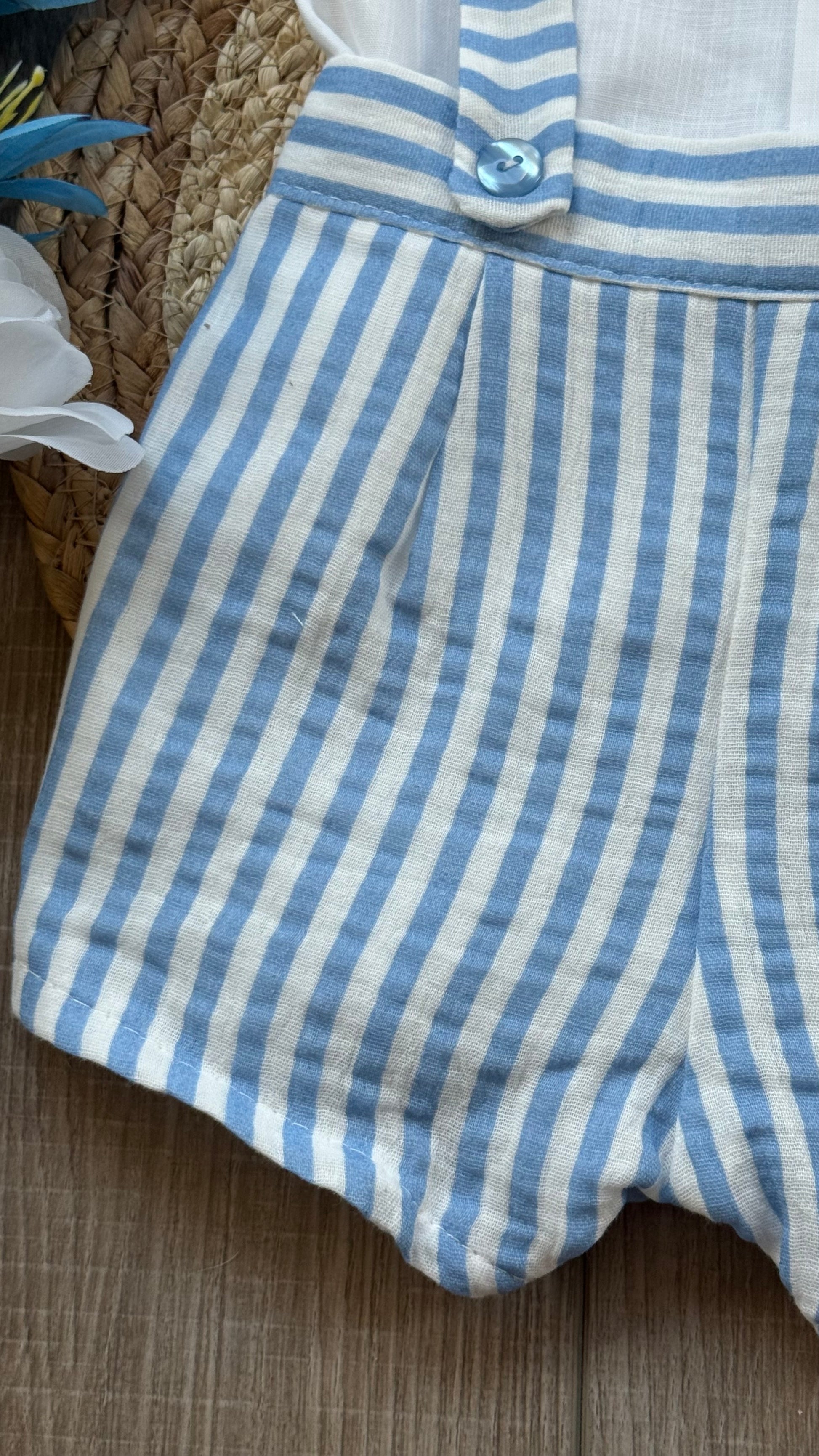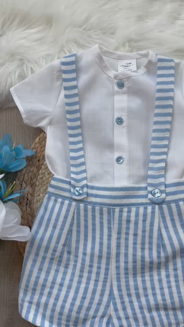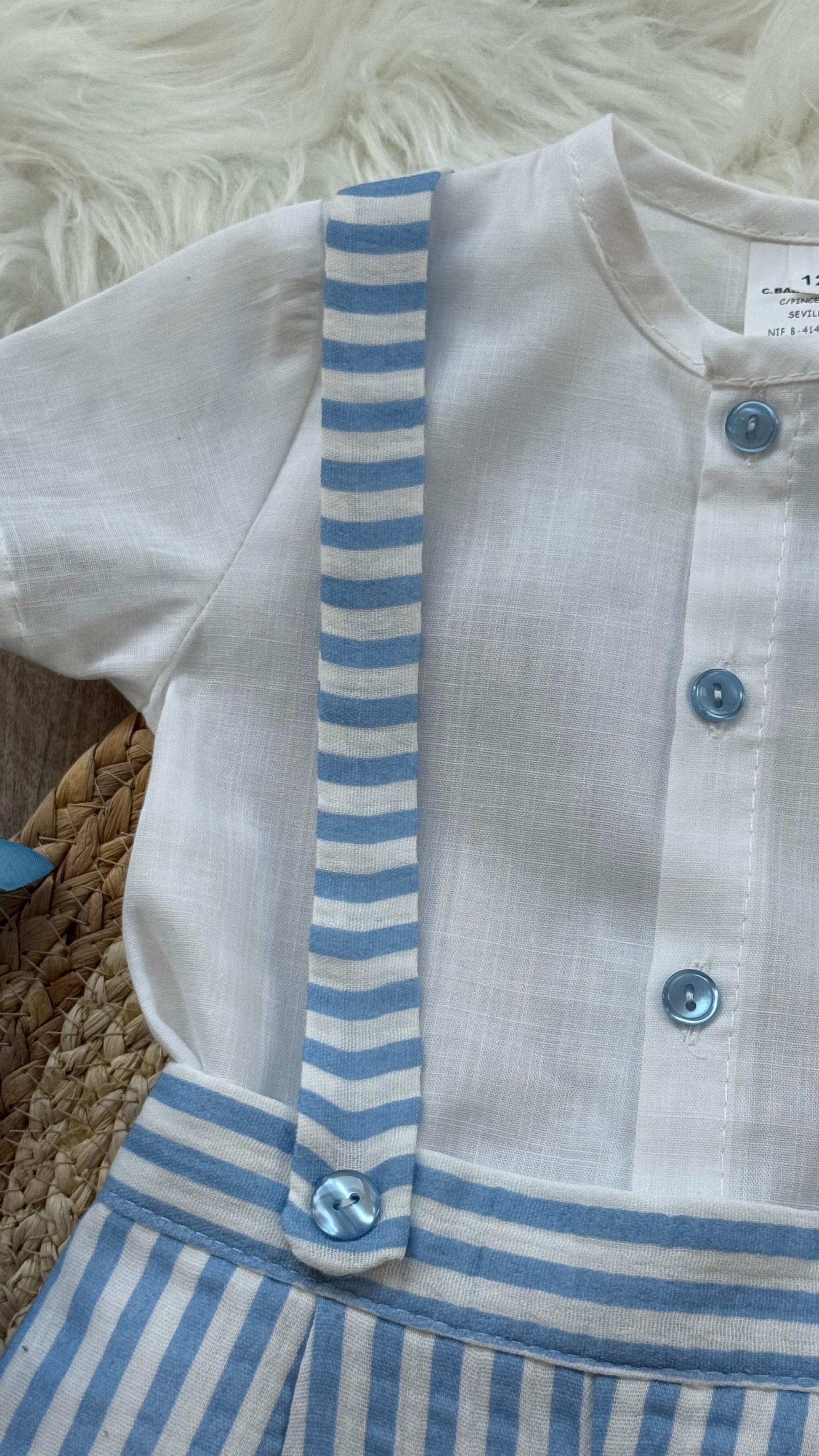Dress your baby in classic style with this charming romper set from Creaciones Baby-Ferr. Featuring a white Peter Pan collar top and striped suspender shorts, it offers comfort and elegance for any occasion.