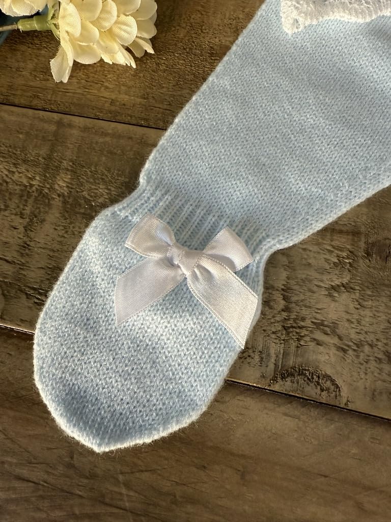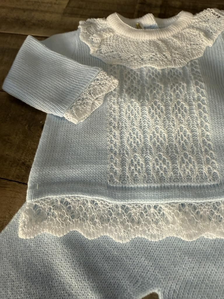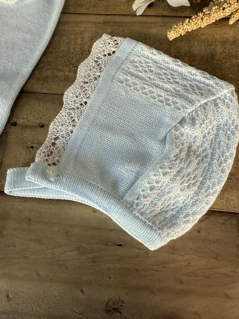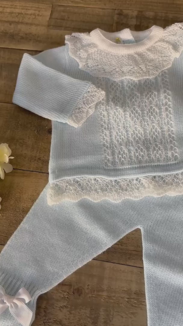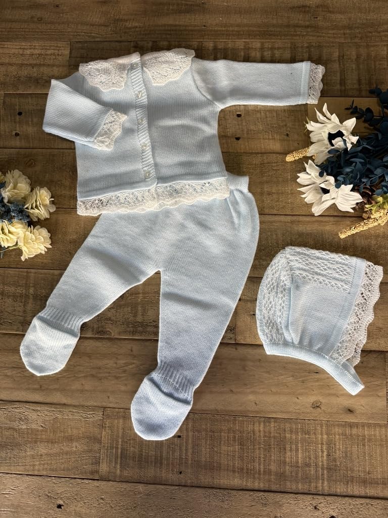 A delicate 3-piece knitted set in soft blue, featuring a lace-detailed sweater, matching pants with bow accents, and a cozy bonnet. Perfect for special occasions or everyday wear.