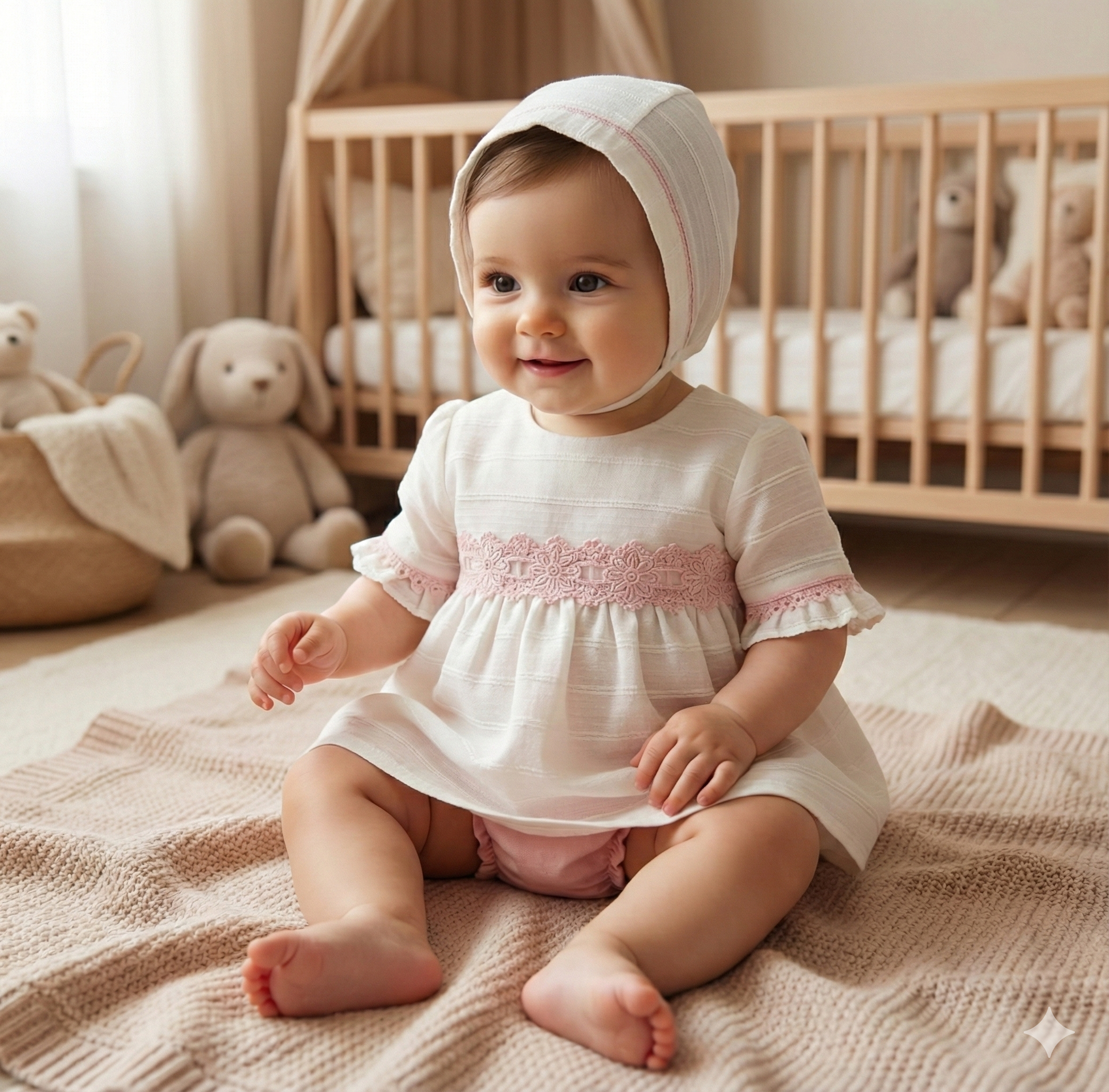 Dress your baby girl in vintage charm with this delicate dress and bloomer set. Featuring ruffled flutter sleeves, a pleated skirt, and matching bloomers for comfort and coverage.