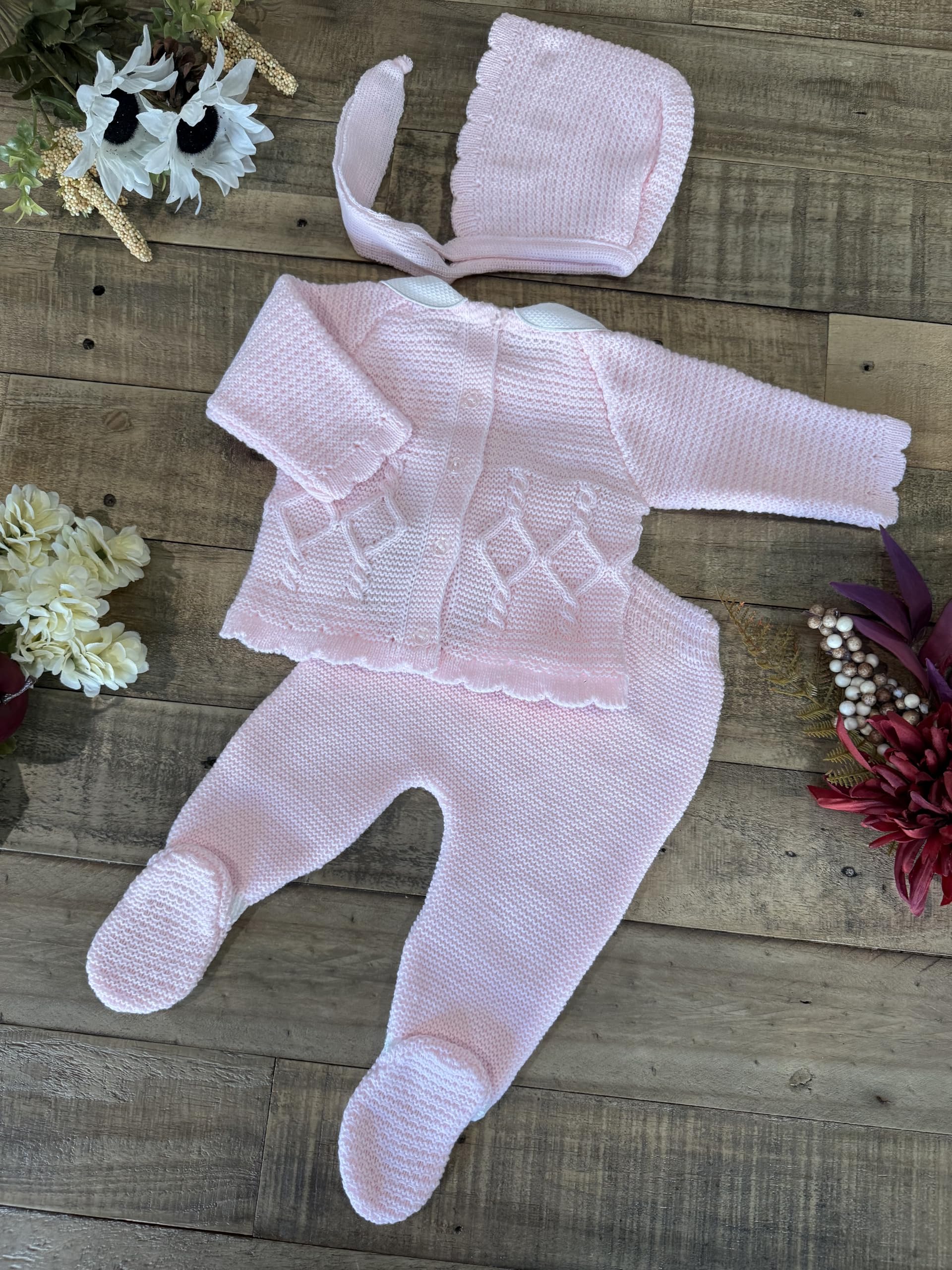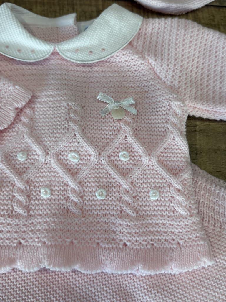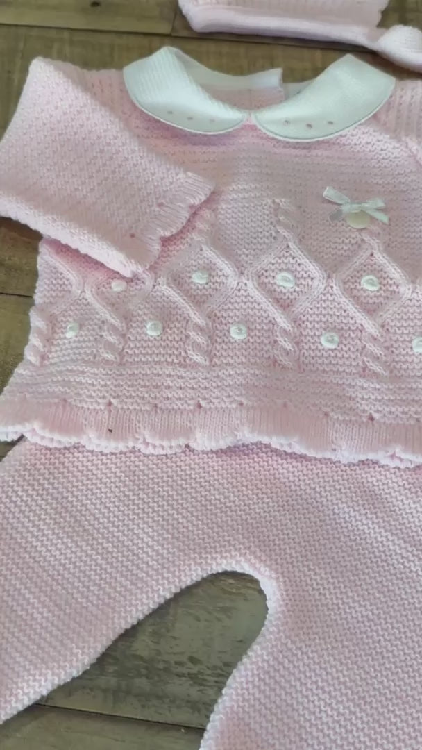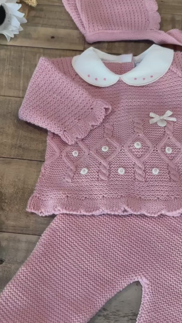 Keep your little one cozy in this soft pink three-piece knitted set. Featuring a charming sweater, footed pants, and matching hat, it’s perfect for warmth and style. Crafted in Spain from gentle, breathable yarn for all-day comfort.