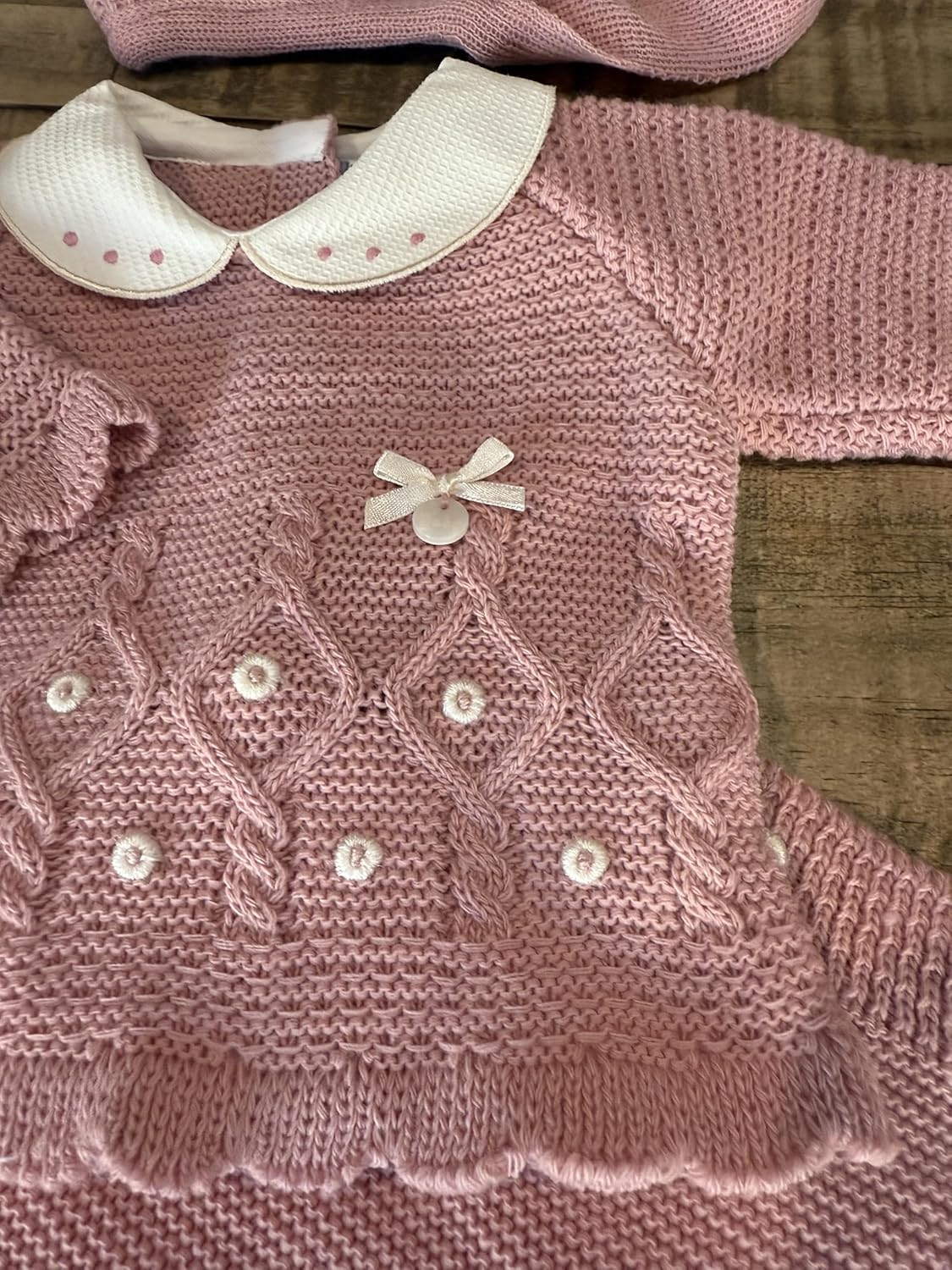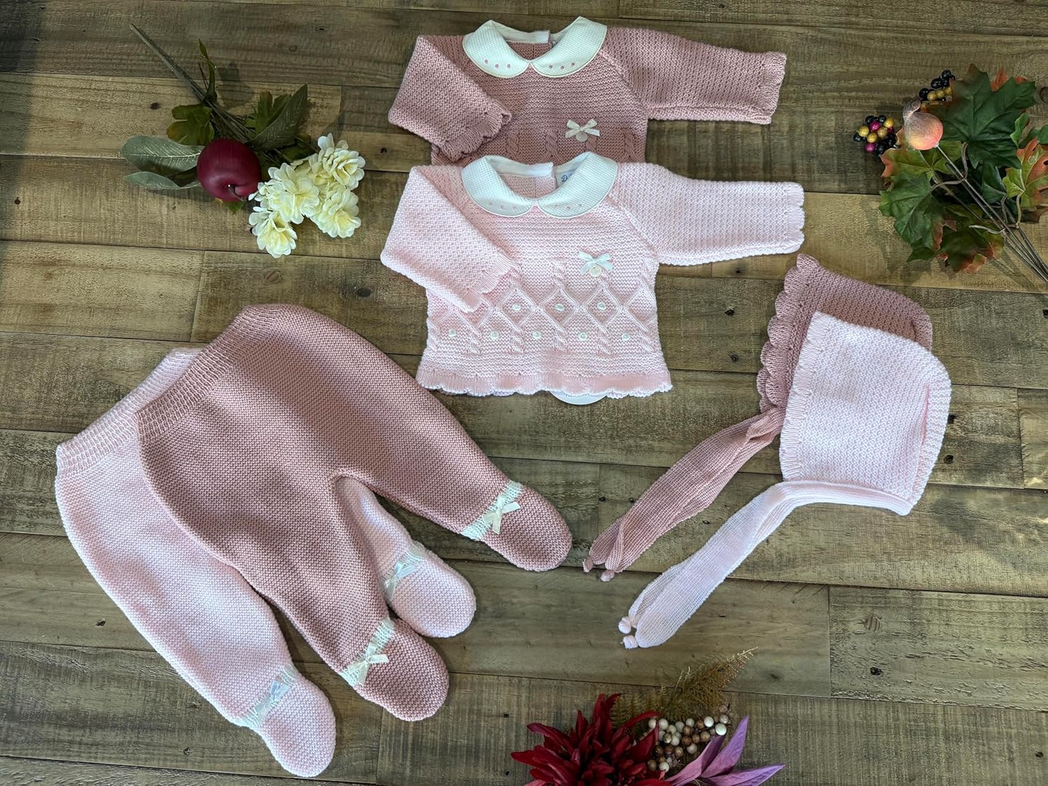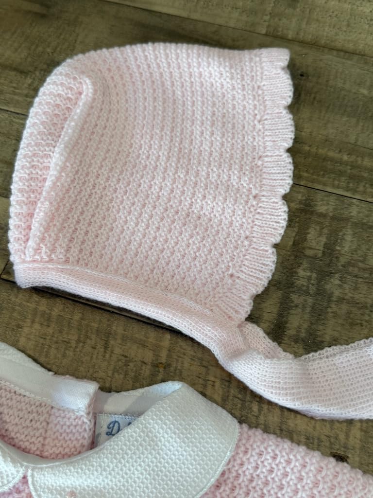 Keep your little one cozy in this soft pink three-piece knitted set. Featuring a charming sweater, footed pants, and matching hat, it’s perfect for warmth and style. Crafted in Spain from gentle, breathable yarn for all-day comfort.