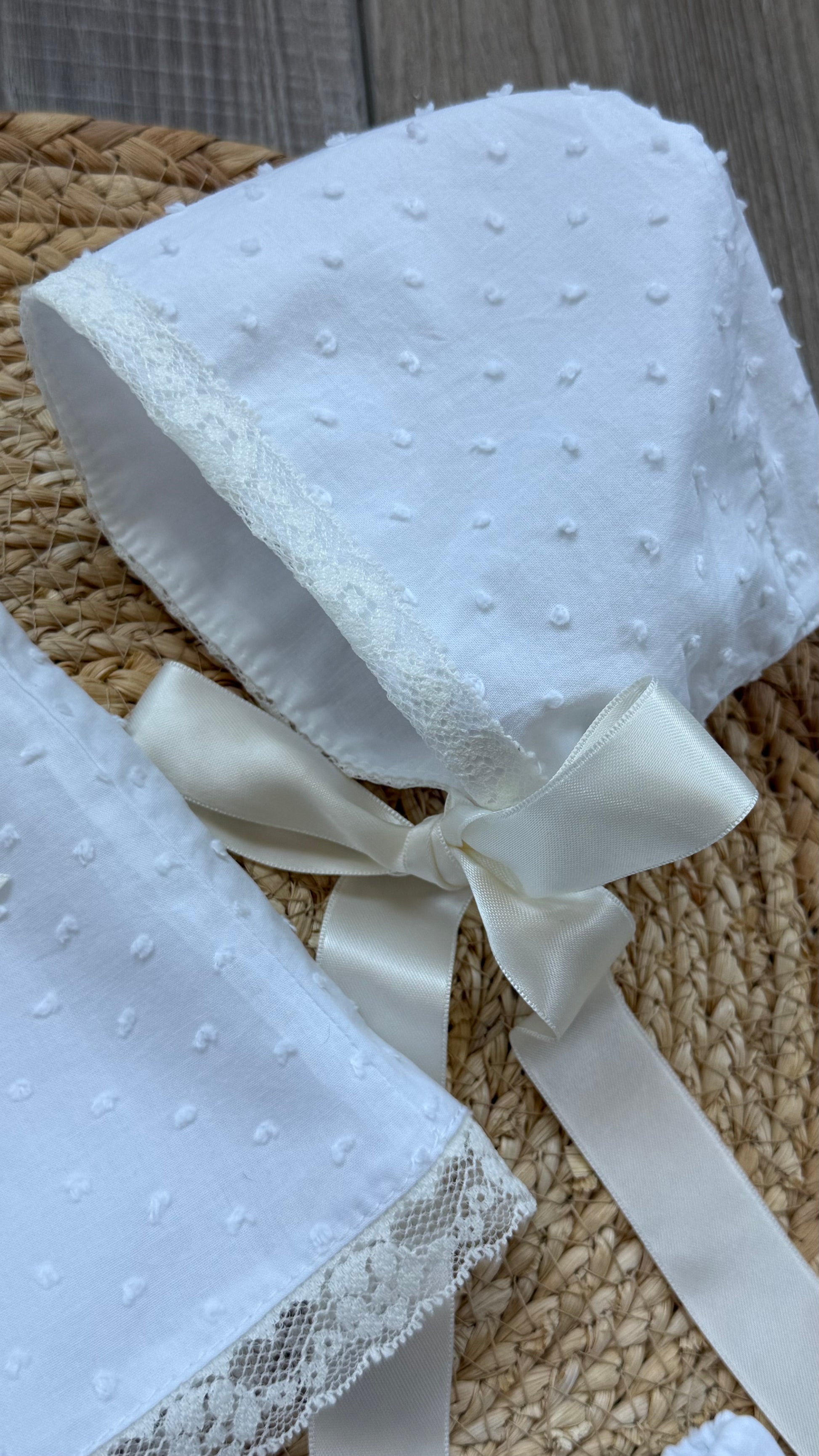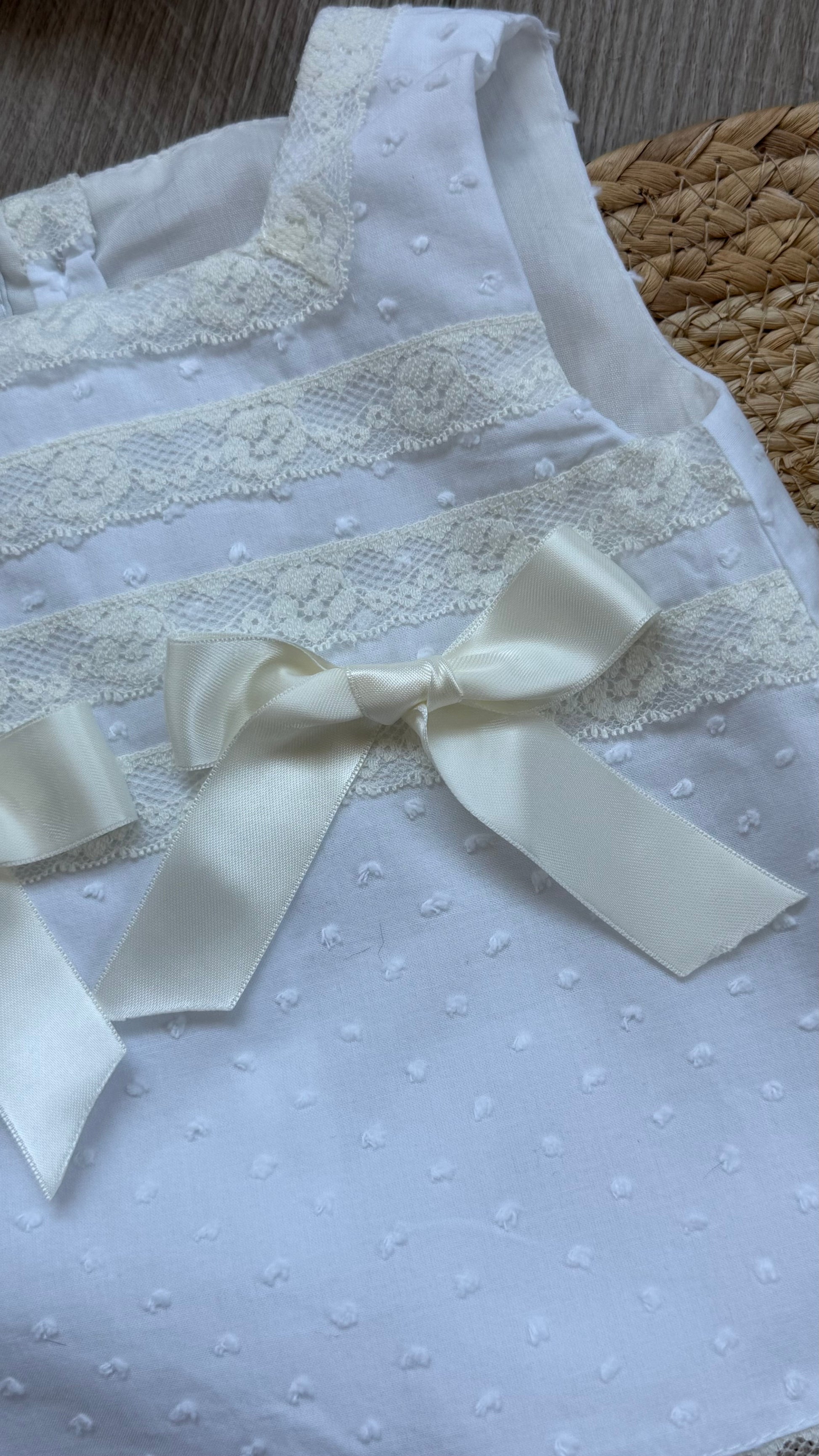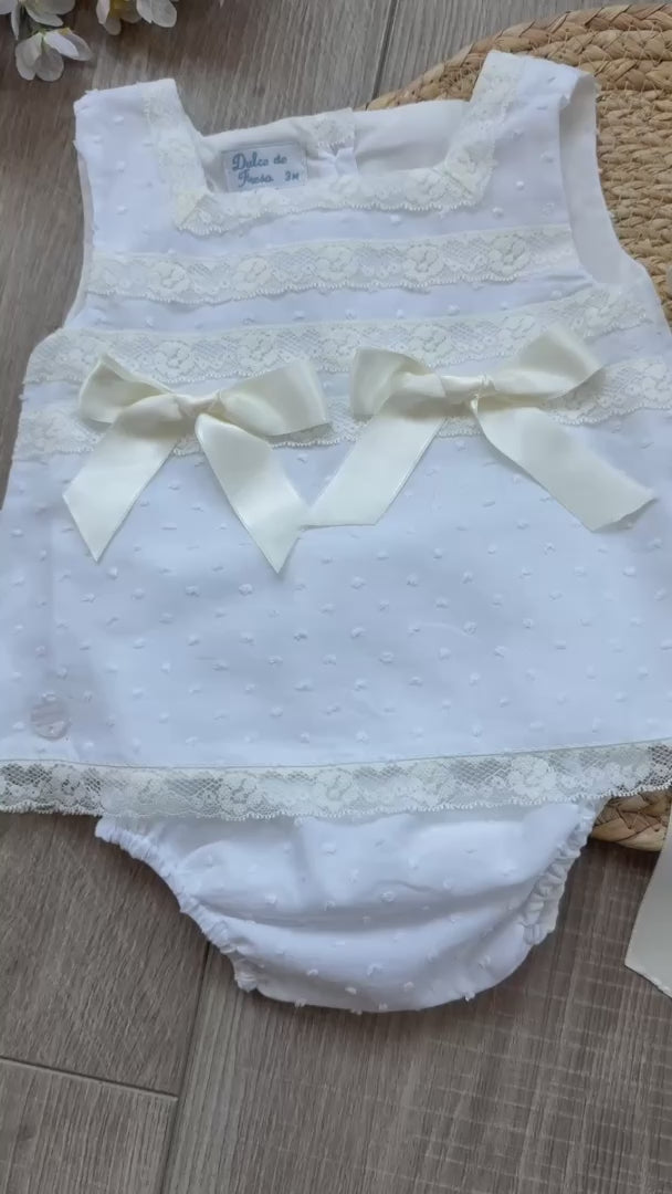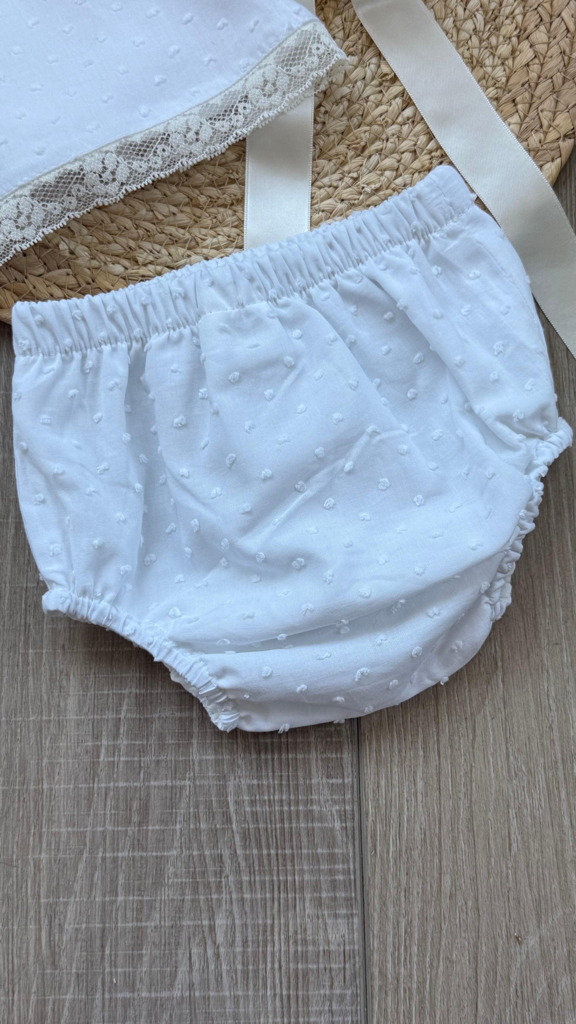 Dress your little one in timeless charm with this 3-piece baby girl set featuring a lace-trimmed sleeveless dress, matching bloomers, and a coordinating bonnet. Perfect for special moments and everyday sweetness.