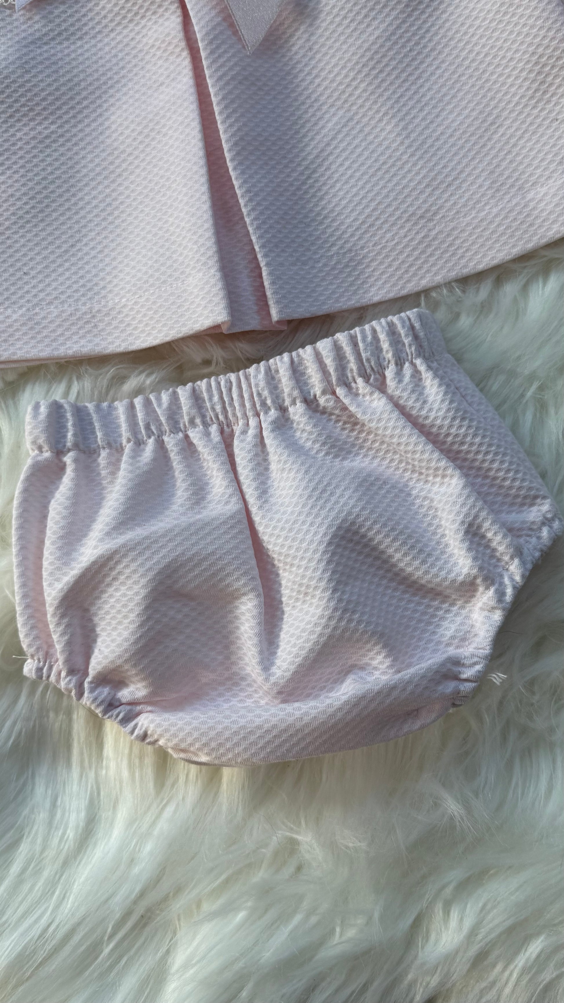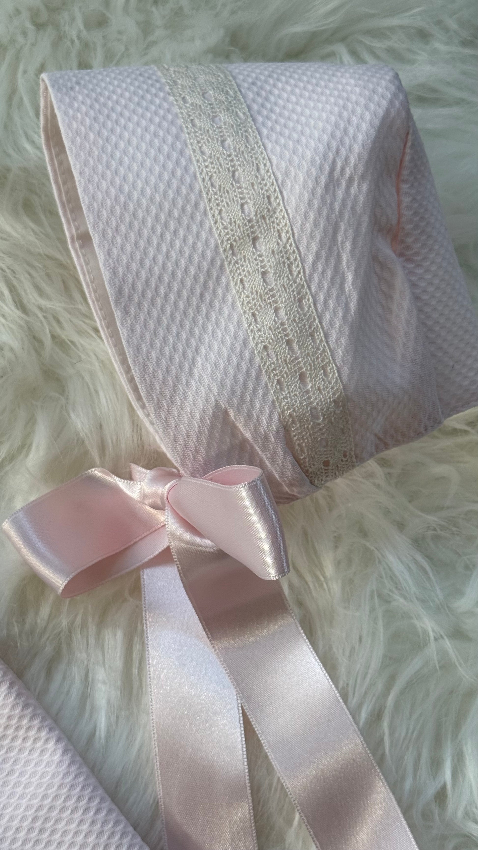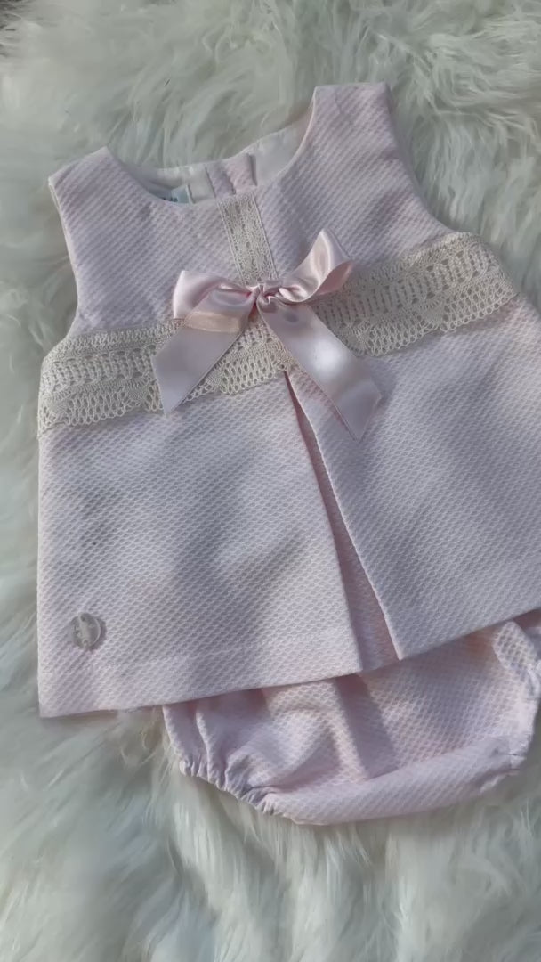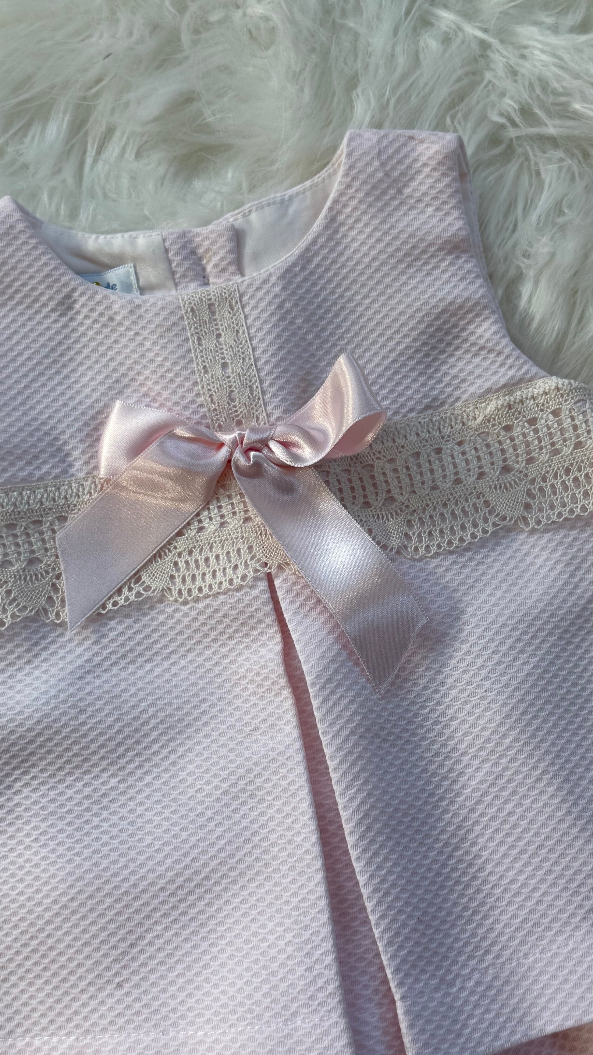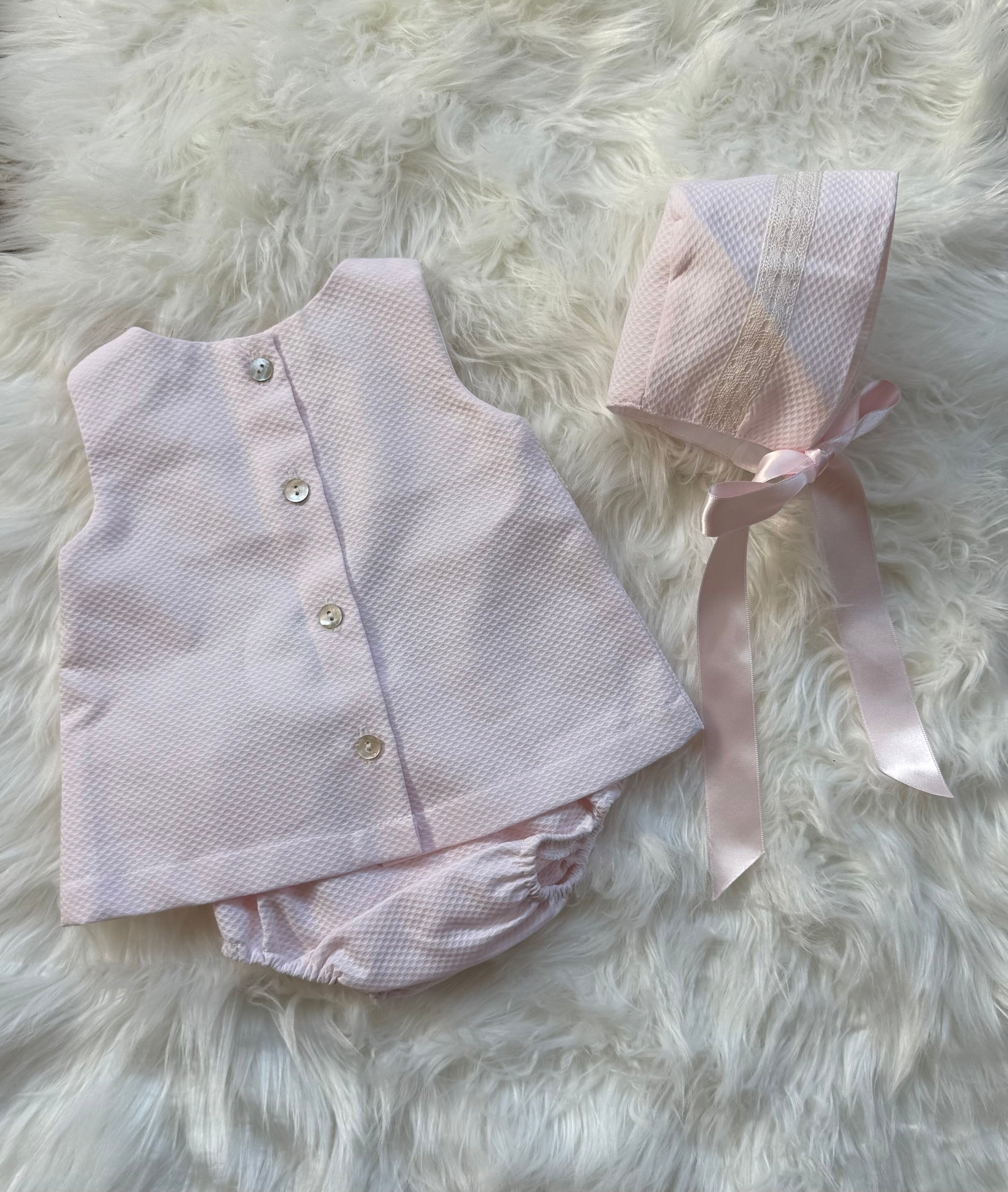 Classic 3-piece baby girl set featuring a sleeveless lace-trimmed dress, matching bonnet, and bloomers. Made in Spain from soft acrylic for year-round comfort and timeless style.