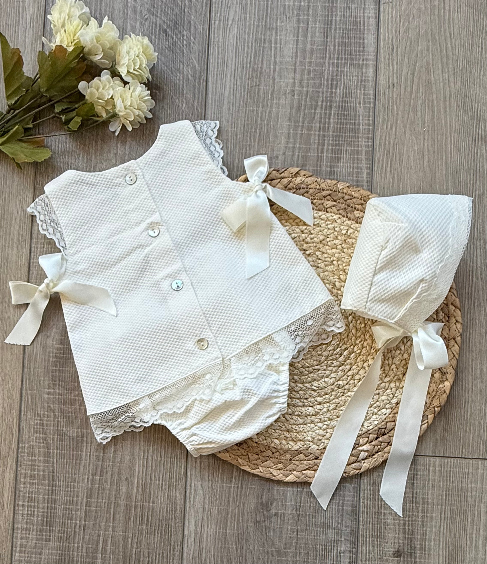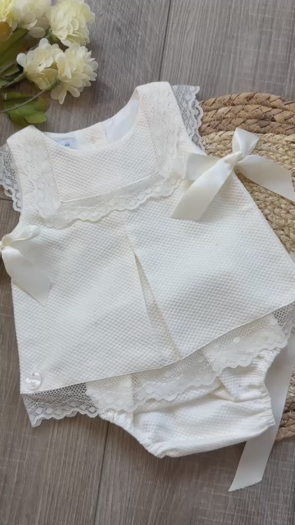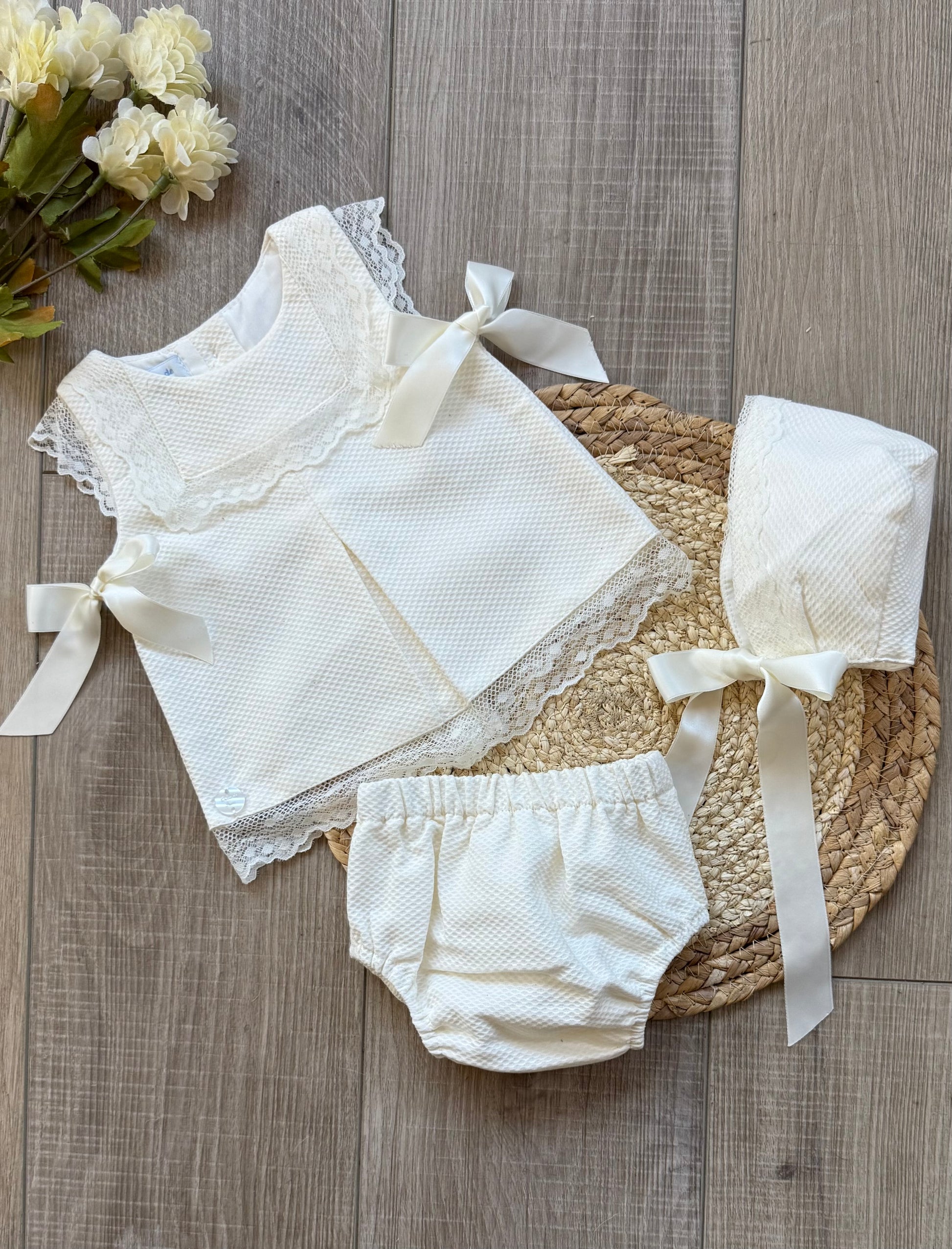 Dress your little one in timeless charm with this elegant 3-piece baby girl set from Dulce de Fresa, combining classic style with delicate details.