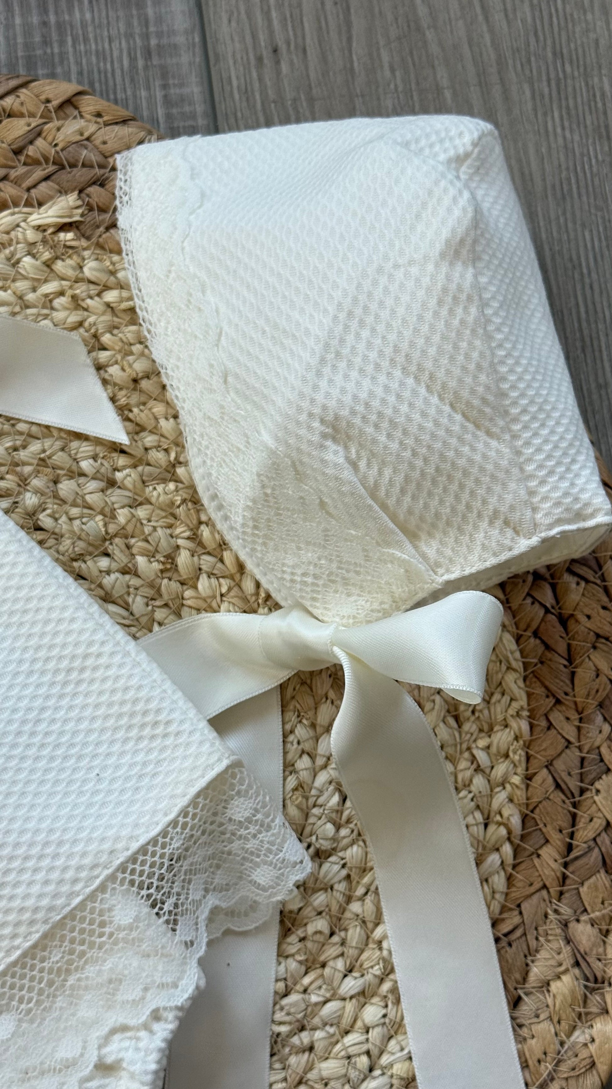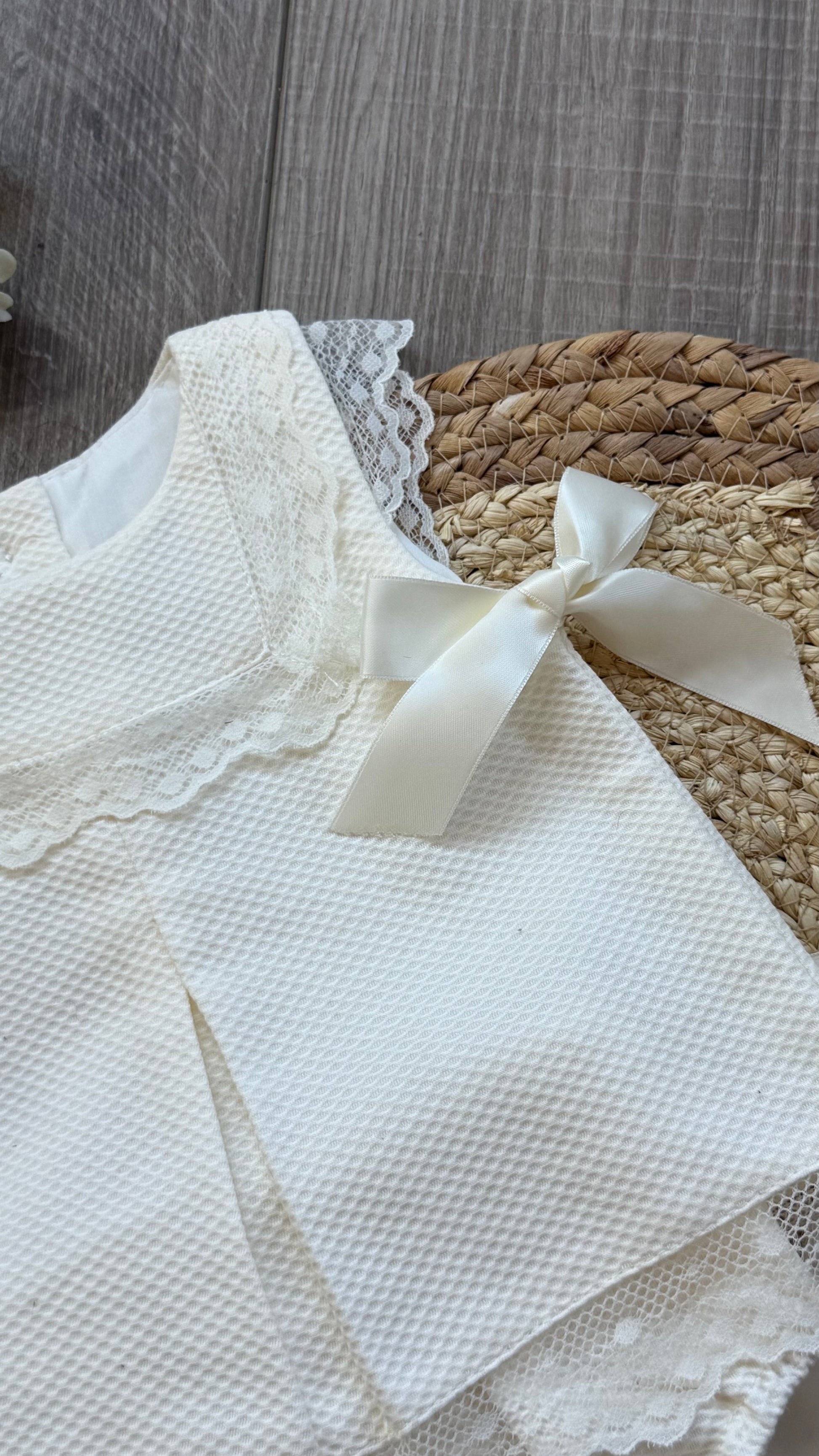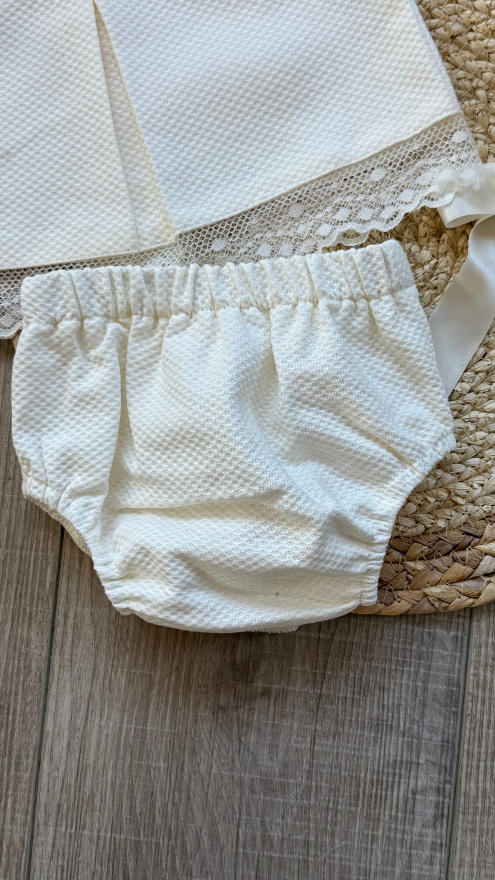 Dress your little one in timeless charm with this elegant 3-piece baby girl set from Dulce de Fresa, combining classic style with delicate details.